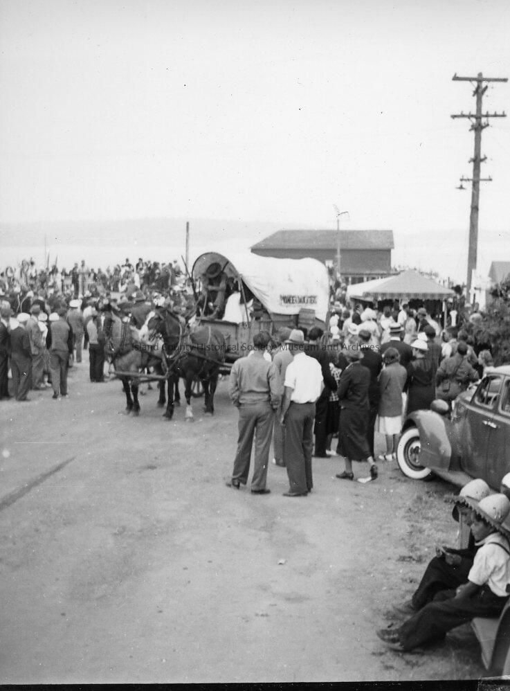 Coupeville Water Festival circa 1930 s. A large group of spectators watching a horse drawn covered wagon going main the street.