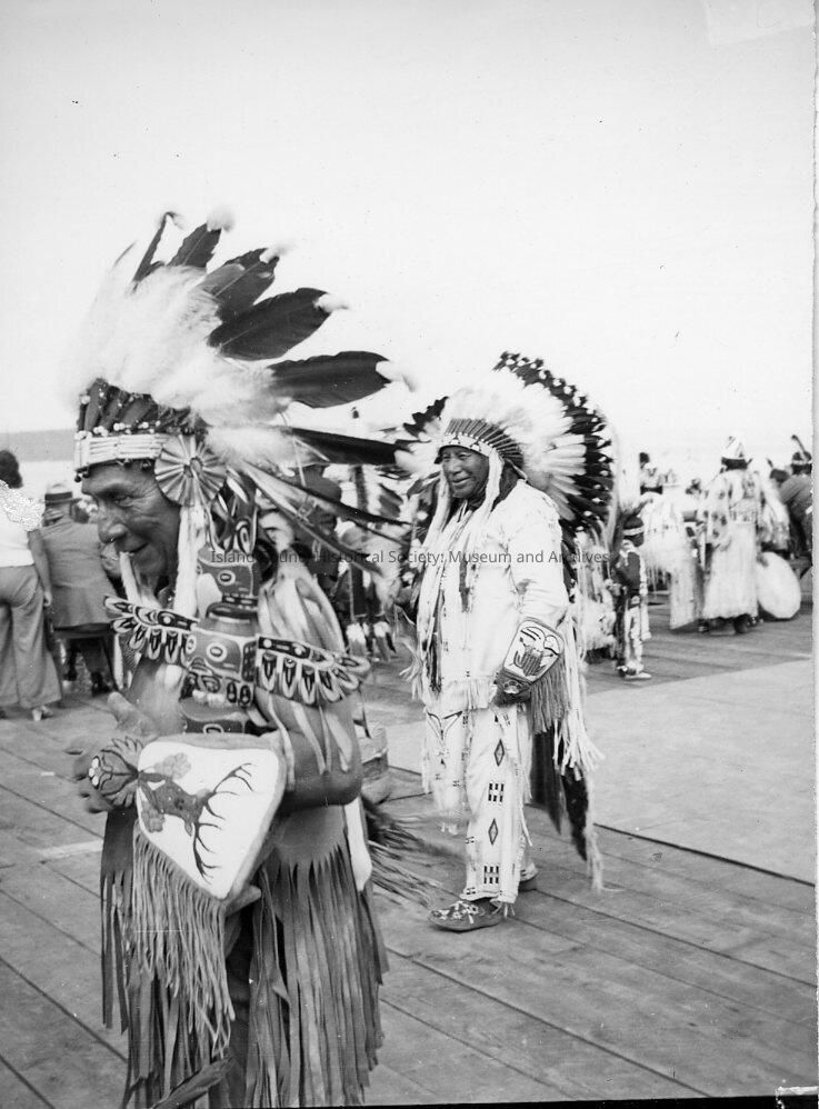 Coupeville Water Festival circa 1930's. Native American man in traditional dress and headress holding a small totem, in the background in another native man in traditional clothing.