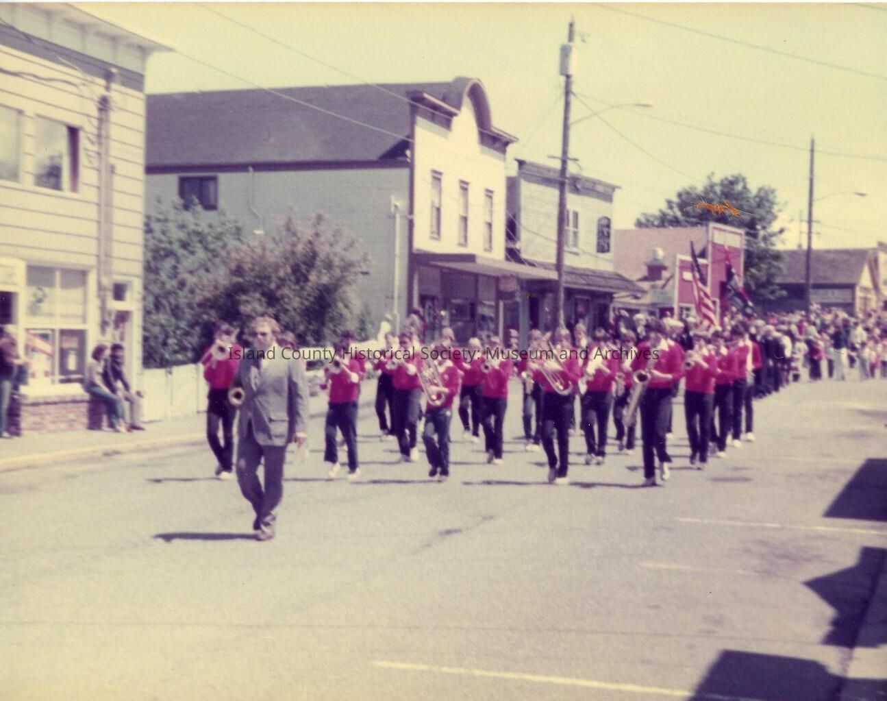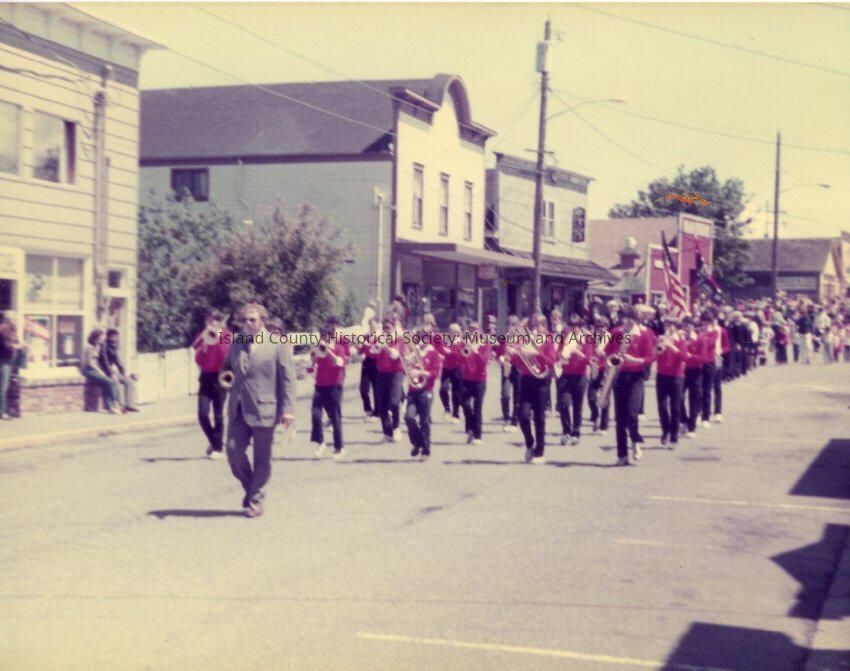 Parade in Coupeville shows a marching band going down front street in Coupeville.