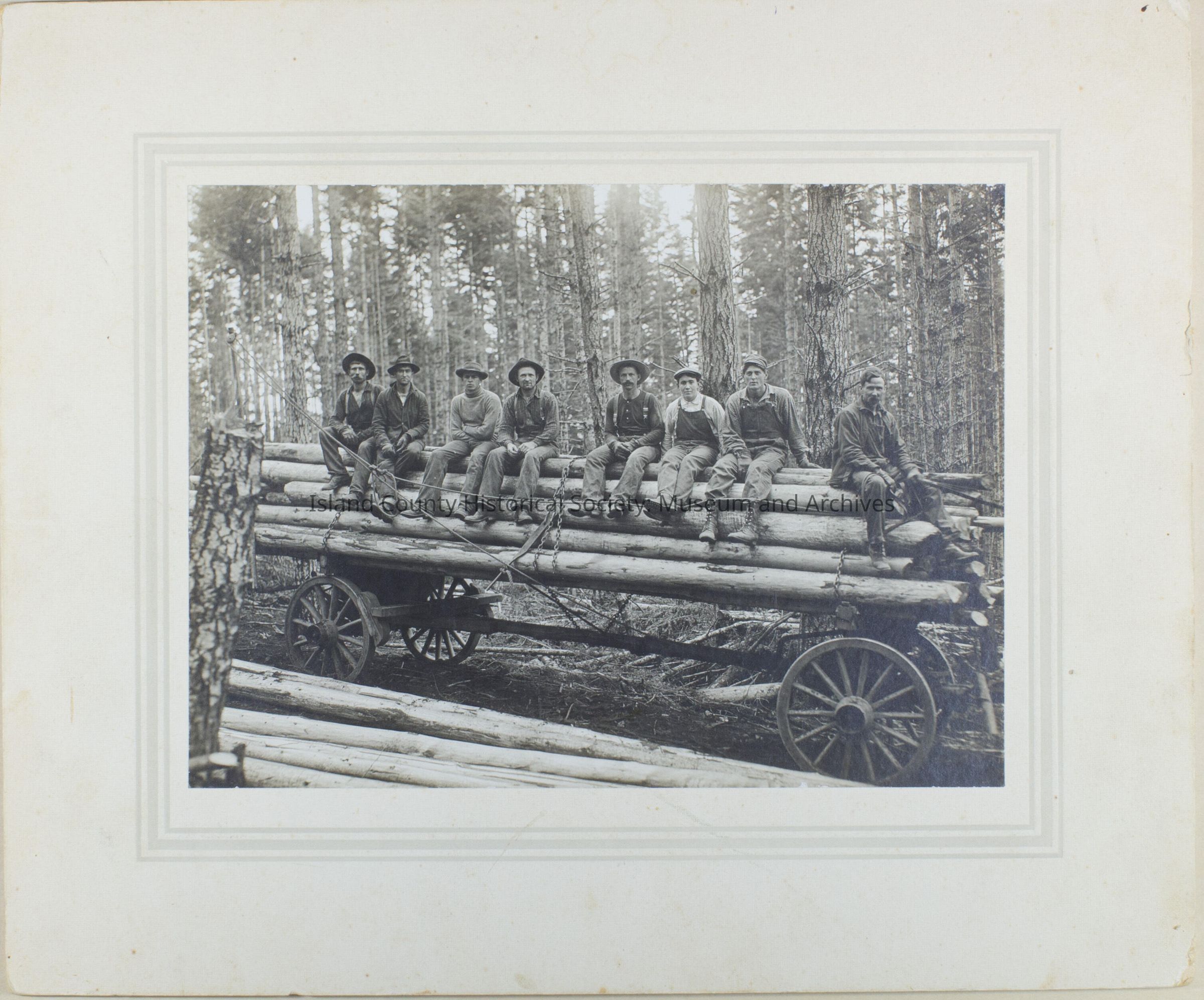 A photo of a group of men sitting on a load of logs. The men are all wearing work clothes and hats. The logs are tied up and ready to be transported. There are many trees in the back and more logs on the ground in the foreground. The back of the photo says, "Alex Shreed 1 on left, Cecil Mitcheel 3 on left, John Sullivan 4 on left, Roy Neil 6 on left, Bill Goagins 7 on left". "24" on the back.Made/Created