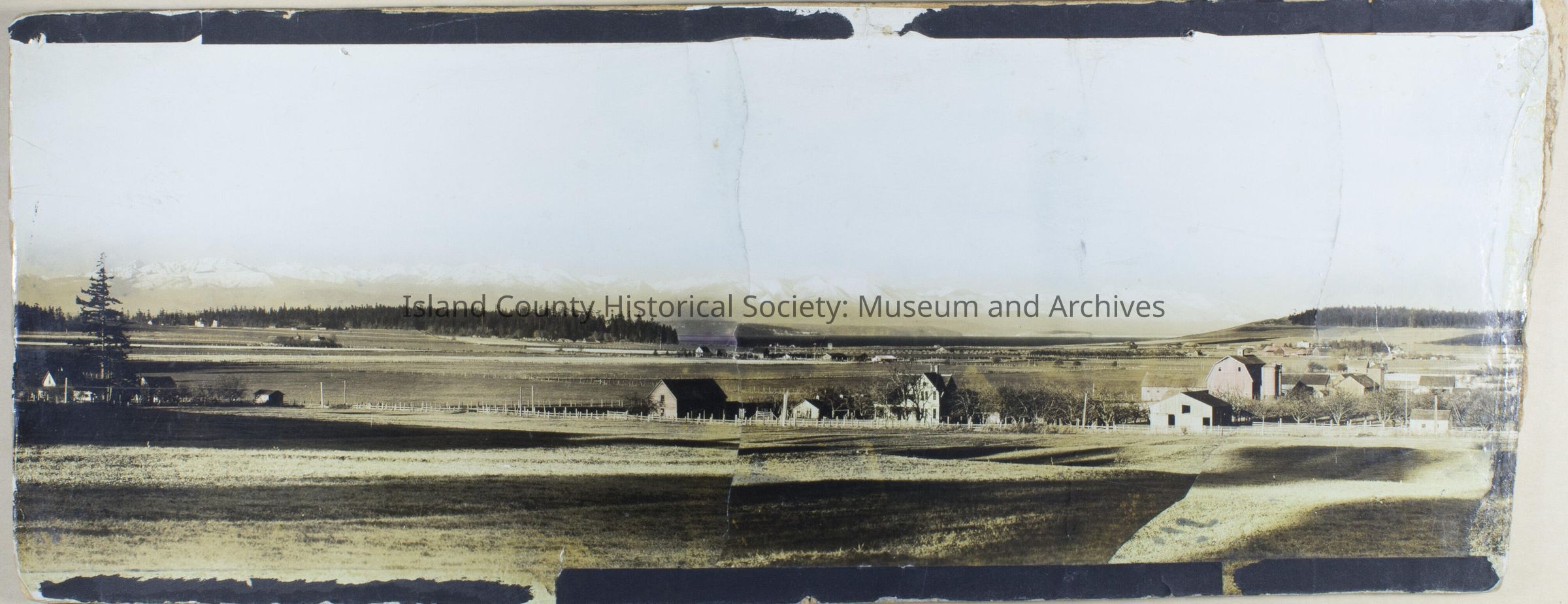 A colorized black and white photo in two pieces of Prairie Center. Farm buildlings, land. Larger section of the two.