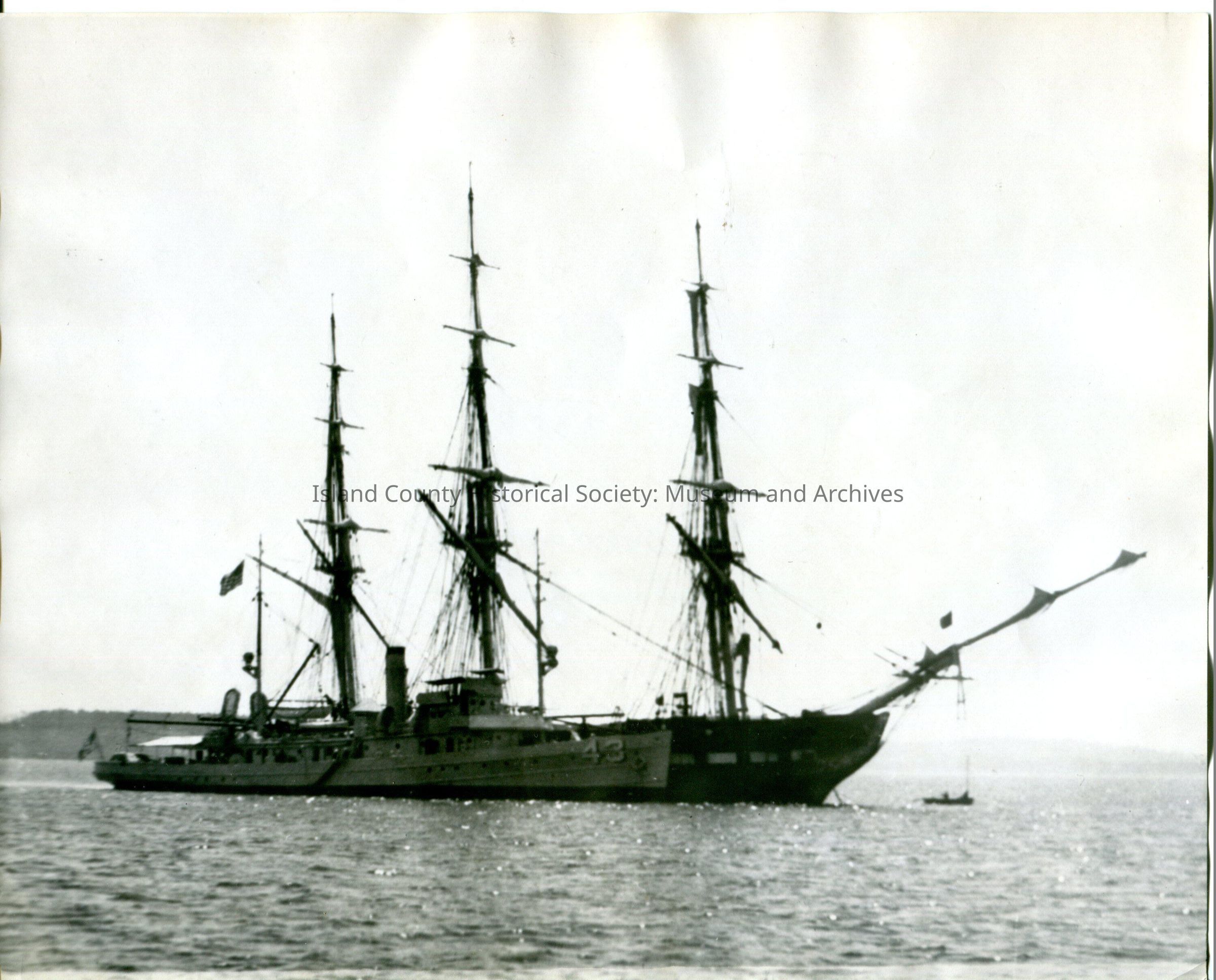 A black and white photo of a large ship. The photo is a copy. There are two American flags flying from the back of the ship. There are three tall masts, but no sails are out. There is a number "43" on the side of the ship. There is a much smaller boat in the water next to the ship. The foreground is water and there is land visible in the background. The back of the photo says, "Coast Guard in OH before 1900".
