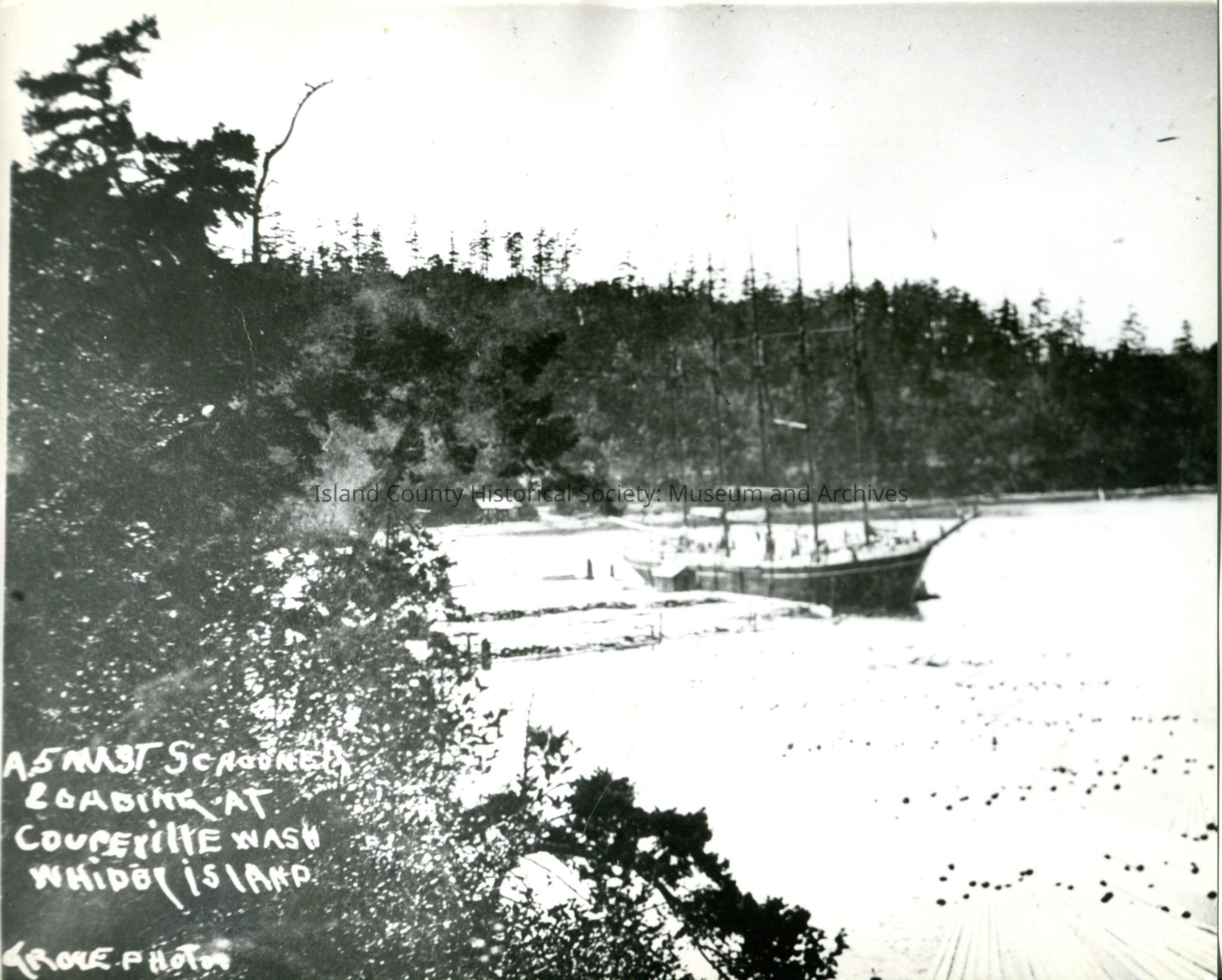 A photo of a large boat in the water. The boat has five masts. There are trees in the background and a couple trees in the foreground. It appears as if the boat is docked (the photo is a copy and it's hard to see details). The bottom left of the photo says, "A 5 mast schooner loading at Coupeville Wash, Whidby Island. Grove Photos".