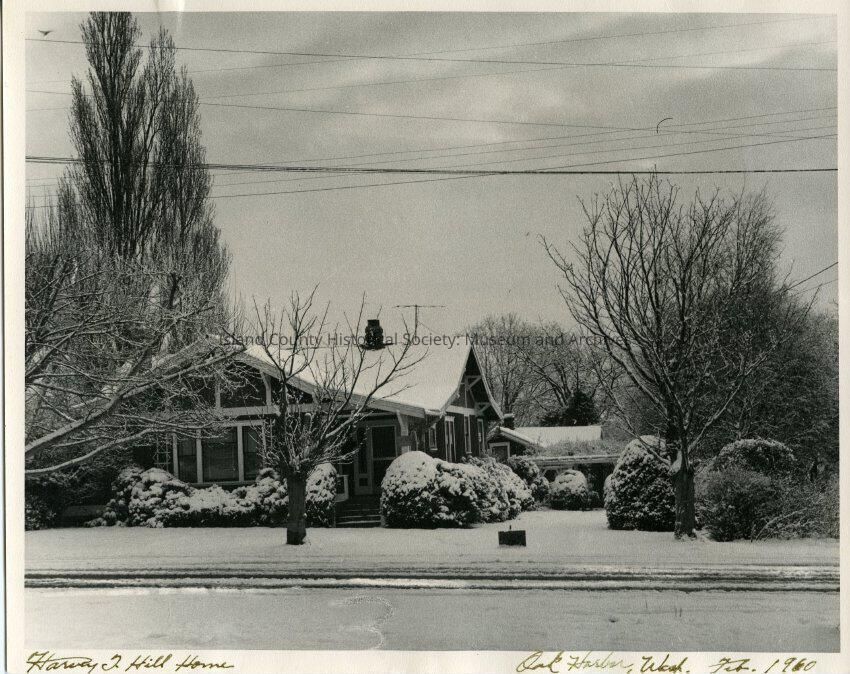 Bottom edge it reads: "Harvey T Hill Home, Oak Harbor, Wash. Feb 1960". A few blemishes including upper right side- small thin arc (pen?) and smudge/scrape- and left bottom- scrape? and "3" in middle. On the back is stamped "1122 2" and there is discolouration from where the frame was.