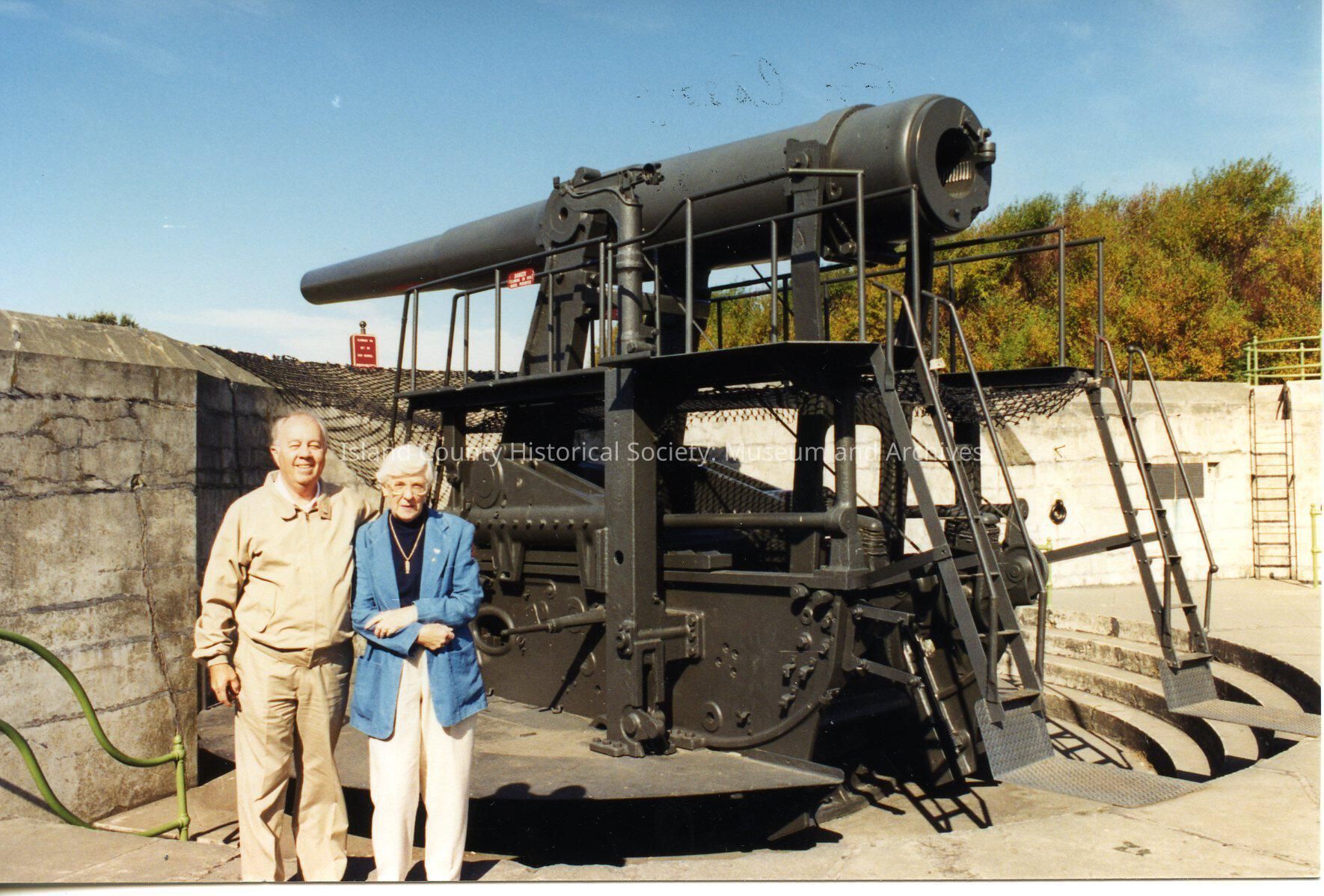 Beside battery at Fort Casey. It is a sunny day with some clouds in the sky. There are a man and woman present in the photo. On back: Bert & Marge, Ft Casey