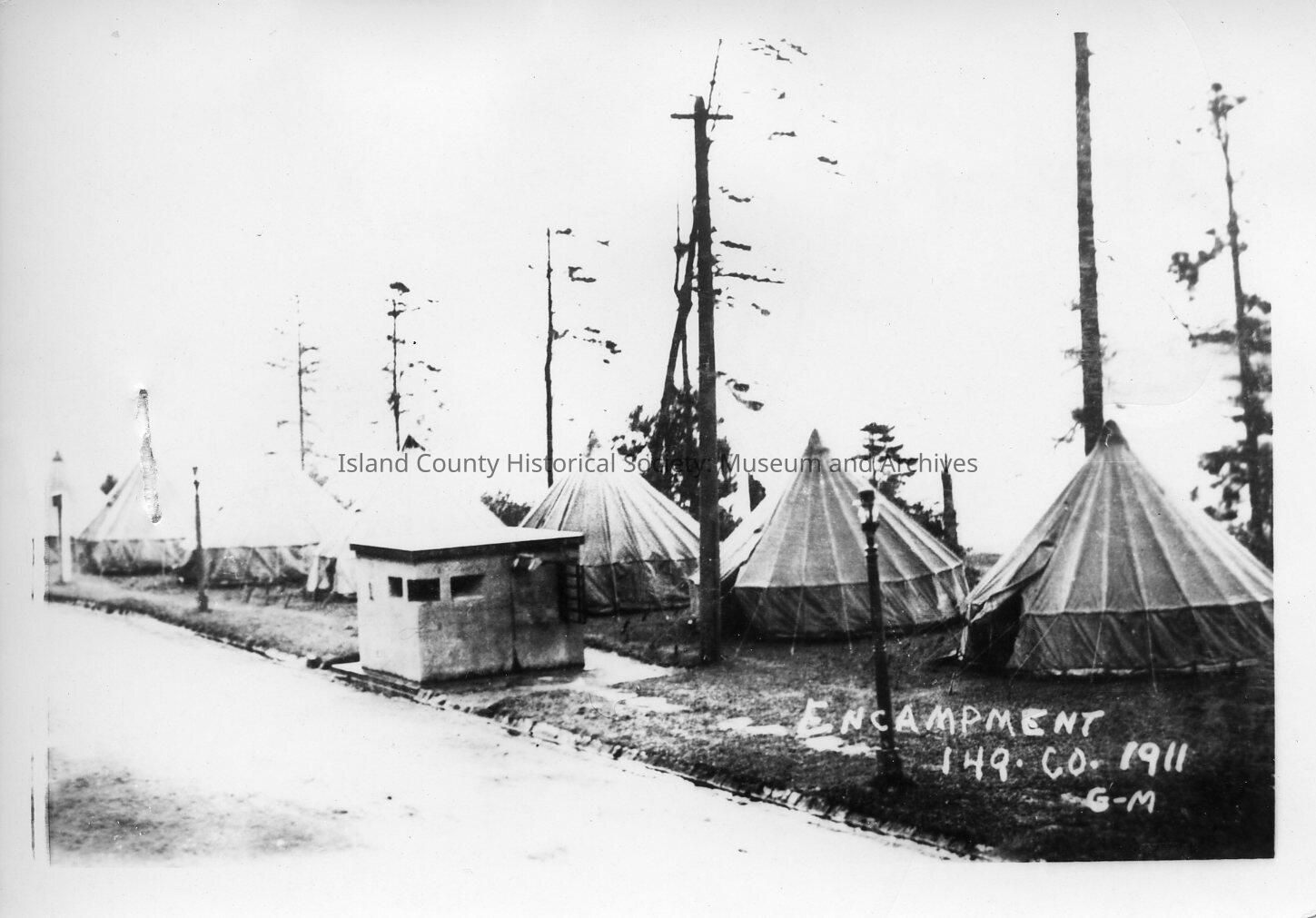 Morter Batteies Battery Parade road. Camera facing north y north east. Image taken on the steps between BAttery Schenck and Battery Seymour. Summer encampment 1911. Two data/telephone booths. Mortar aiming data received from the plotting room then written on boards and pushed out on the near side. The crews would look at the boards and know what zone and azimuth/elevation angles are needed to load and aim the mortars. Notice the kerosene lamp posts. Also the plotting rooms were in the fire control building adjacent to the lighthouse. The plotting room foundations currently seen today were from the new plotting rooms constructed in 1915. SJK