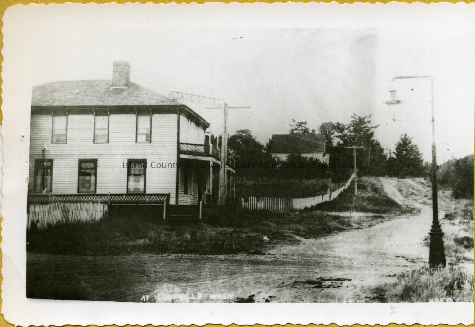 Black and white photo of the State Hotel in Coupeville, WA. Later, it burned down and was replaced by the Island County Historical Society Museum.