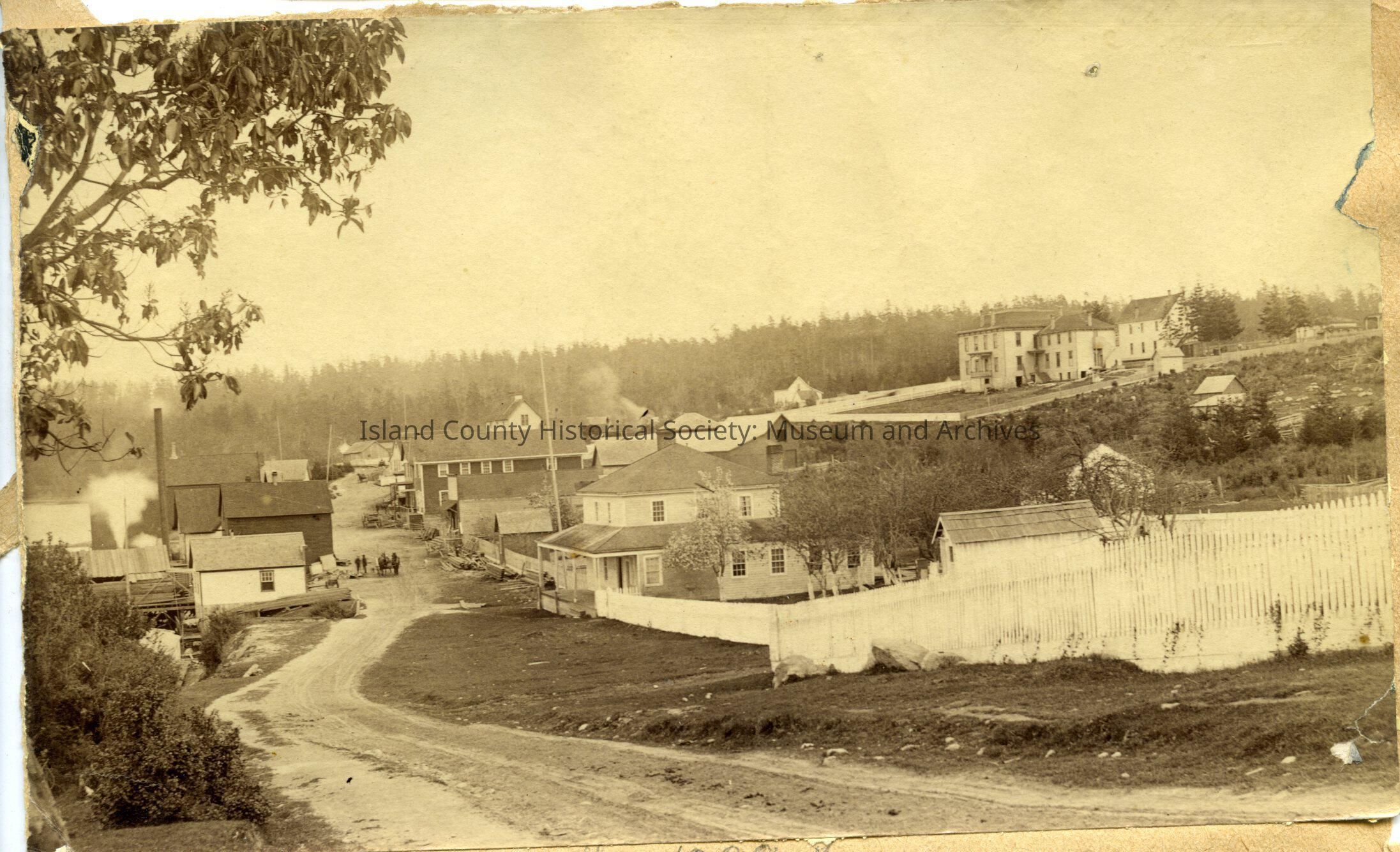 Photo of Front Street in Coupeville, 1888. Picture was taken from road looking towards downtown buildings. A white picket fence runs along the road. There are two people on the street with 2 horses. The Puget Sound Academy on a hill overlooks Front Street.