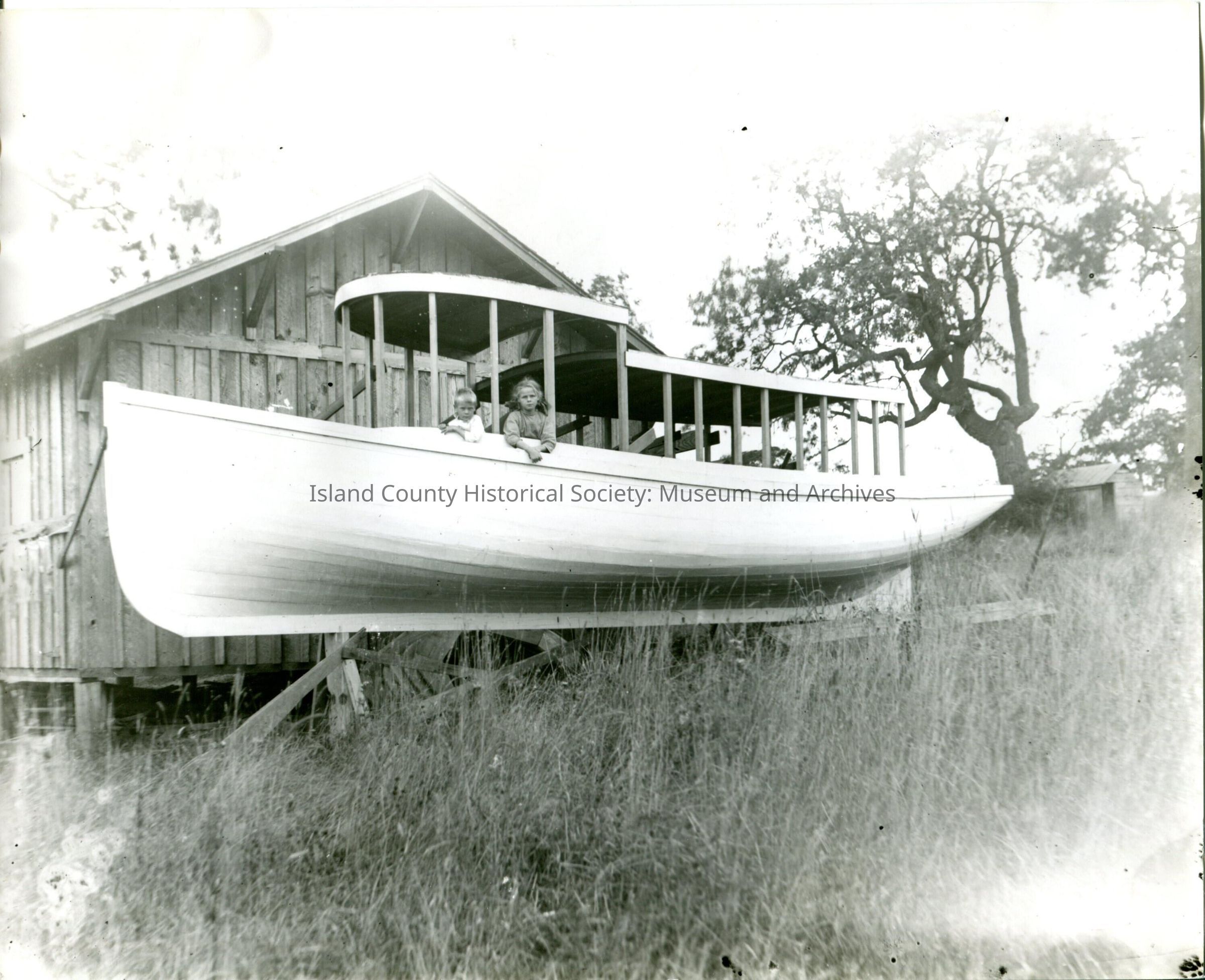A black and white photo of a small boat up on a frame in front of a small barn with two children looking over the side. On the back: Otto Van Dyk Children? Launch built in the 1920s. Children are not Otto's - they are older -