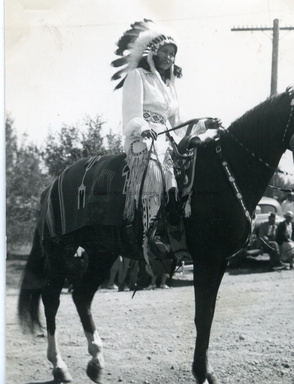 Photo water festival in Coupeville. Native American woman in ceremonial dress on horse back. On the back: *Main Street Aug 9-10-11