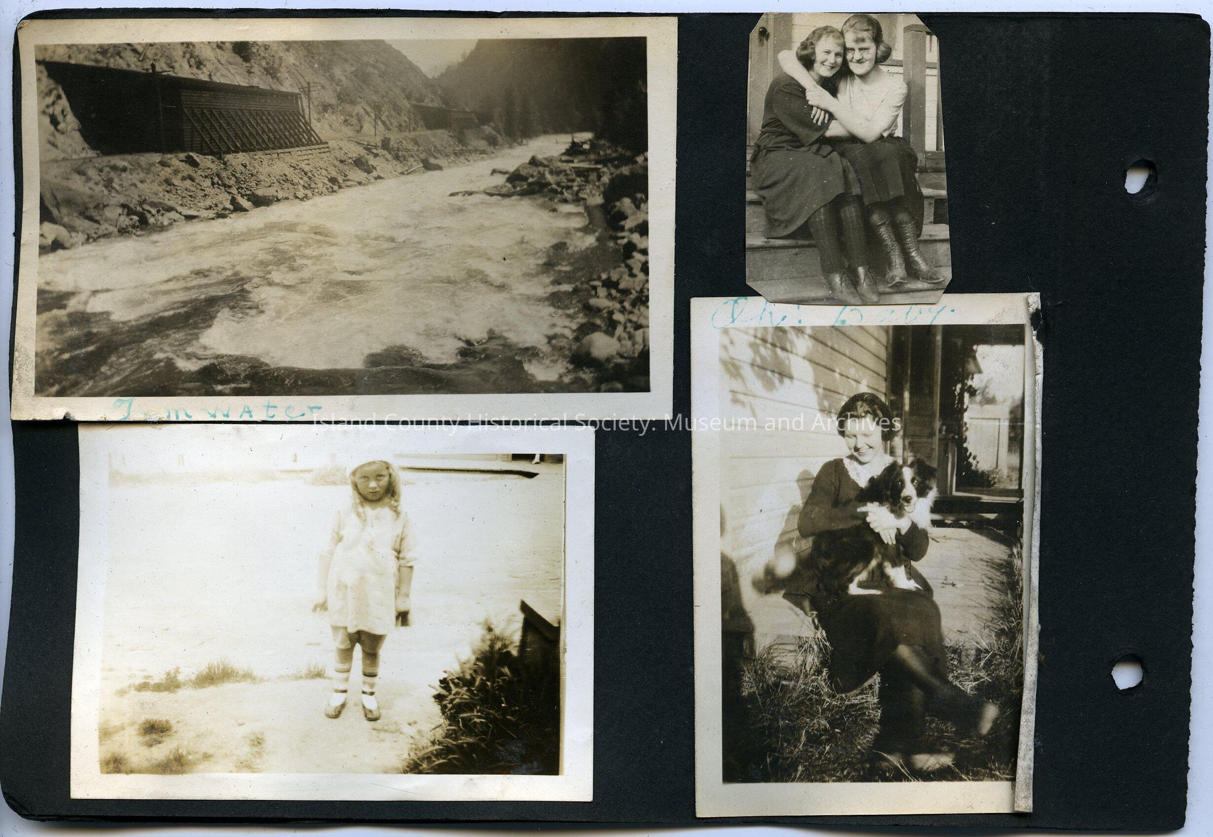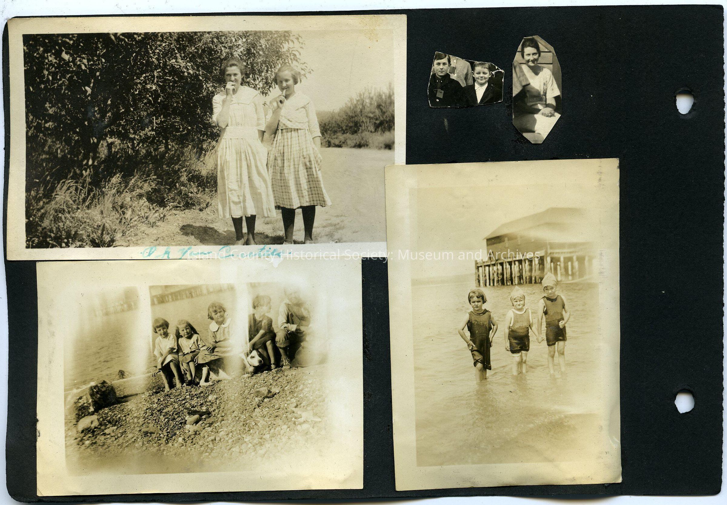 Bottom Right: Three young girls standing in water with Coupeville Wharf in the background. Girl on left has hands on her hips nad is wearing a one piece suit. Center girl is wearing cap, one piece swimsuit. Girl on right is wearing cap and one piece swimsuit. Center girl and girl on the right are holding hands (same two girls from 2016.152.001j). 2.5" by 3.5"