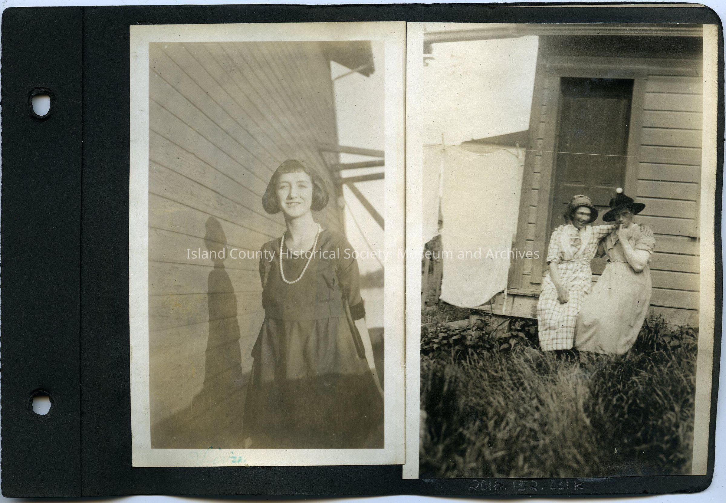 Left: Young woman wearing dark dress and pearls standing in front of building with wood horizontal siding. "Vivian" written on bottom. 3" by 5"