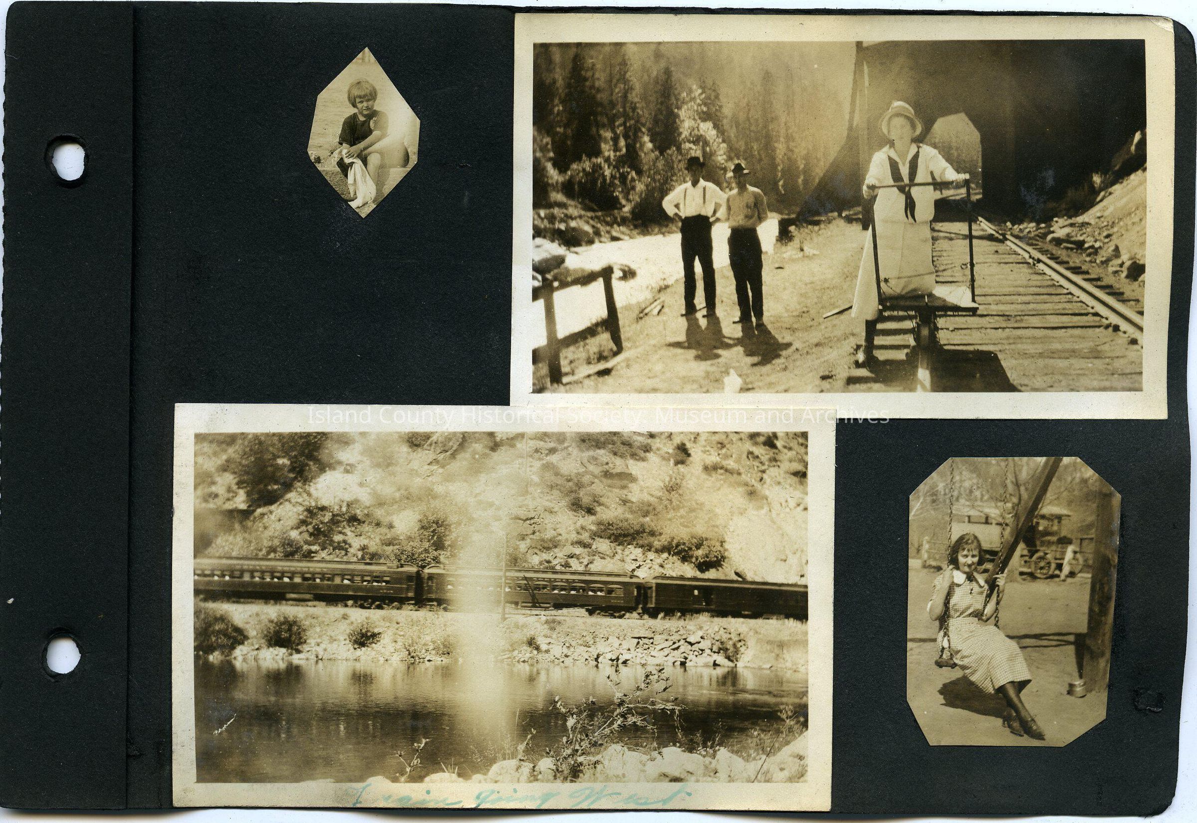 Top Right: Women in hat, scarf, and white shirt and skirt riding on a railroad track along a river with a wood bridge in the background. Two men are to her left watching her. Man on left is wearing hat, suspenders, light shirt, and pants with hands on hips. Man on right is wearing hat, shirt, and pants with hands behind him. 4.5" by 2.5"