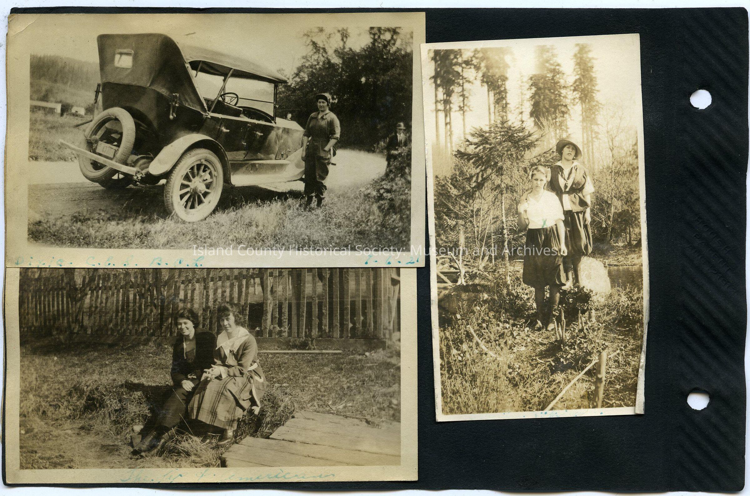 Top Left: Woman in hat and coveralls standing in front of a car with cloth top. License plate "477??" Same car and woman as 2016.152.001p. "Dixie CES B.O.L. 7-6-21" written on bottom. 4.5" by 2.75"