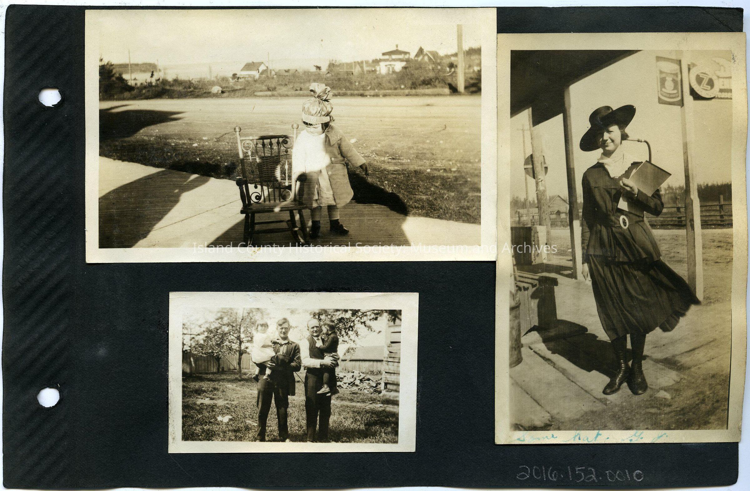 Top Left: Toddler in hat with a bow on top and jacket standing by a rocking chair and looking down (same toddler as 2016.152.001n and 2016.152.001p). Coupeville in background. 4.5" by 2.75"