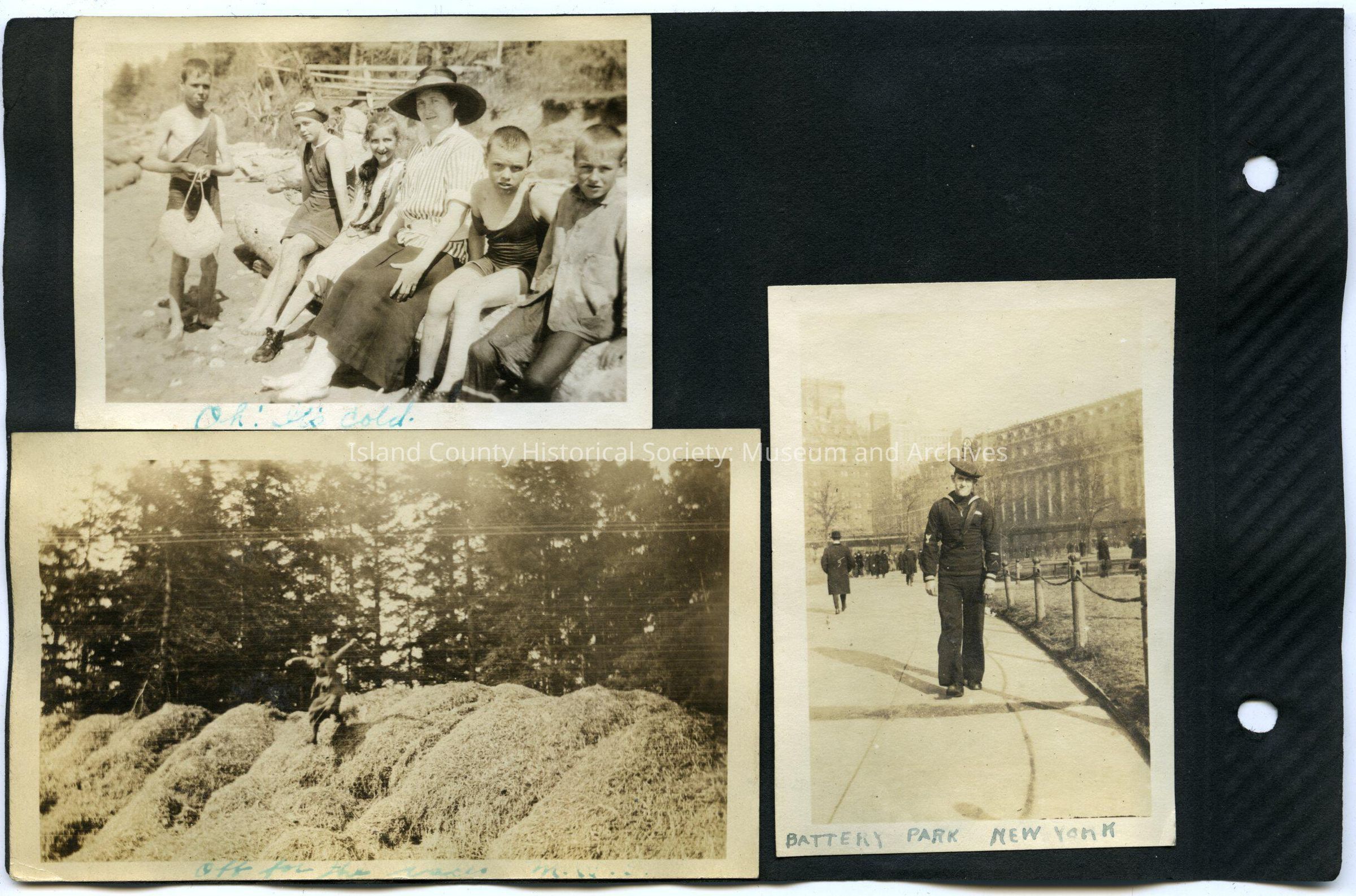 Bottom Right: Toddler wearing hat with bow on top and jacket standing by rocking chair. Same toddler as 2016.152.001o. Coupeville in background. 4.5" by 2.75"