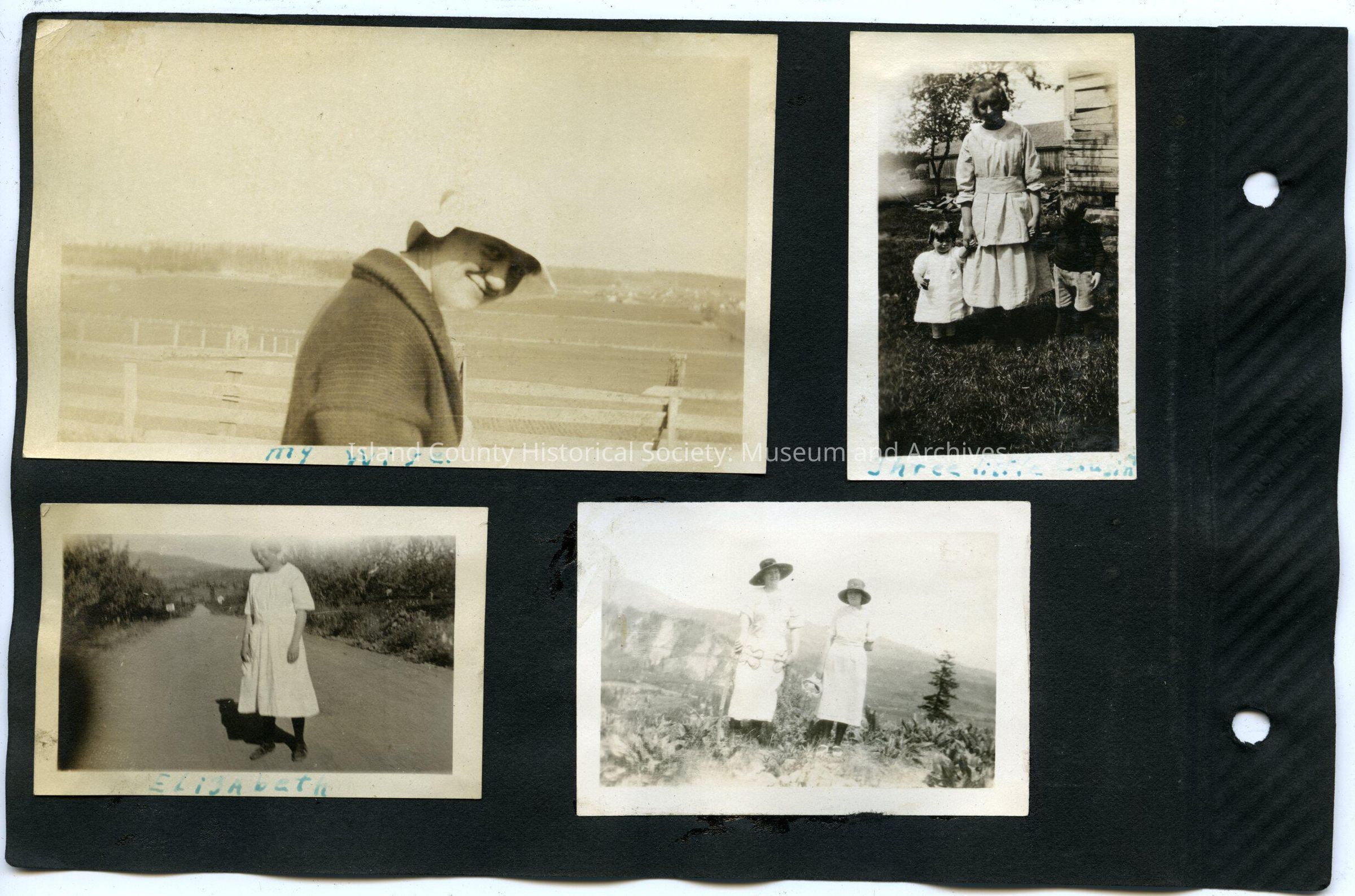 Bottom Right: Two women, both wearing white dresses and brimmed hats, standing on hill r mountain. Pine tree in background. 2.75" by 2"