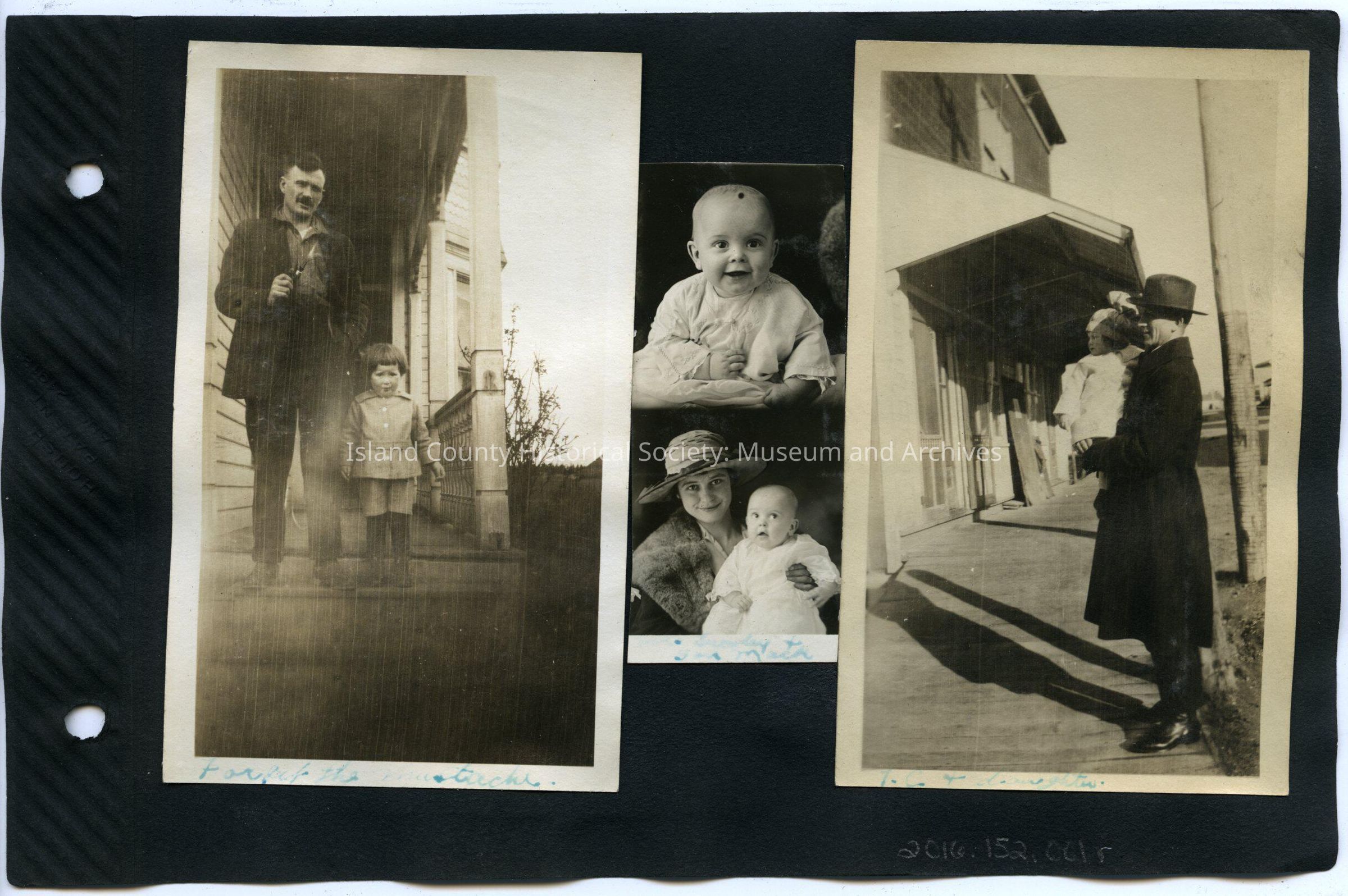 Top Right: Young woman in dress holding hands with a toddler girl and toddler boy. Tree and wood pile in the background. "Three ?? ??" written on bottom. 1.75" by 2.75"