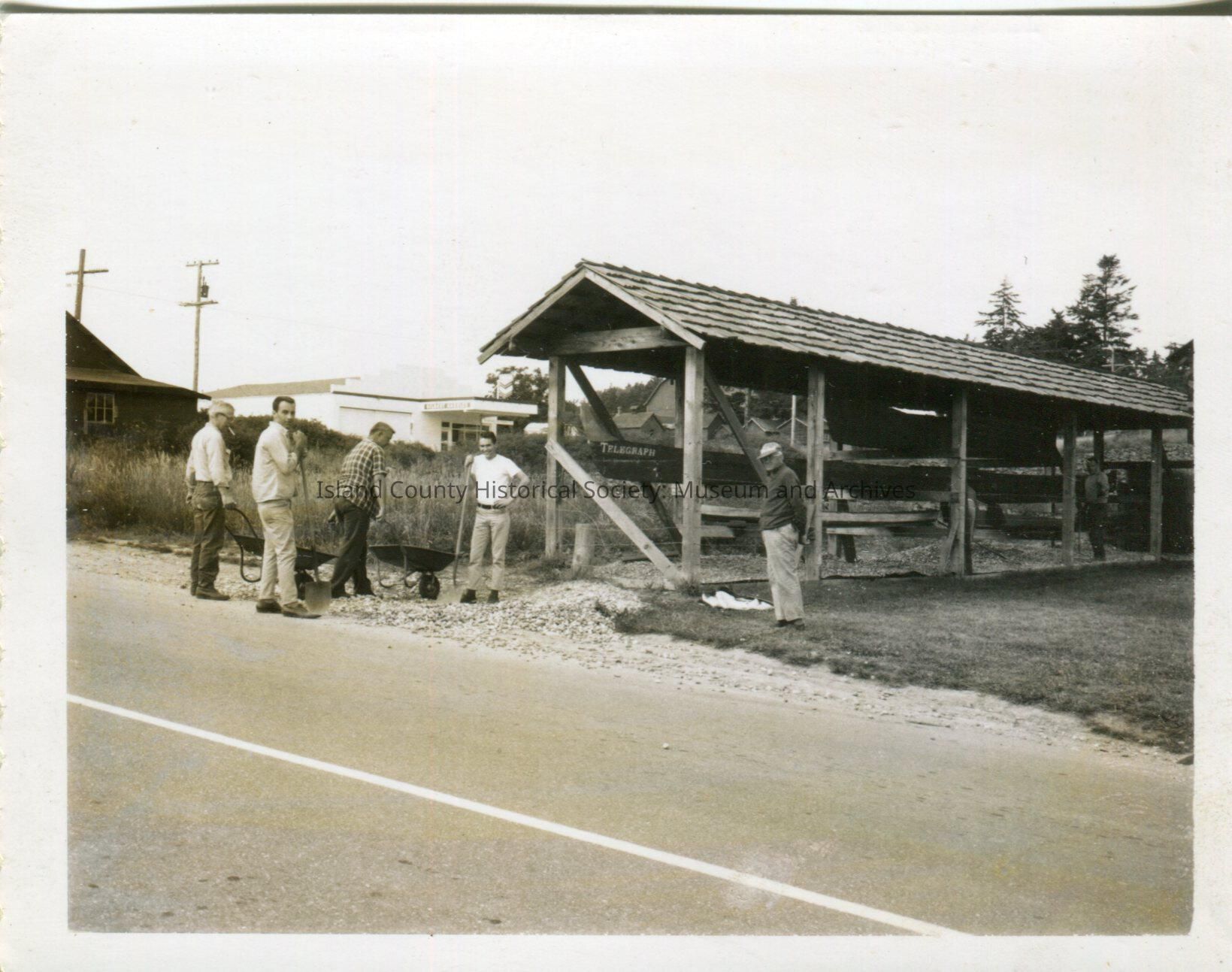 Adding a canoe to the canoe shed beside the blockhouse and museum. Workers gathered around. Marty's gas station partly visible in the background. The "Telegraph" canoe is visible in the shed.