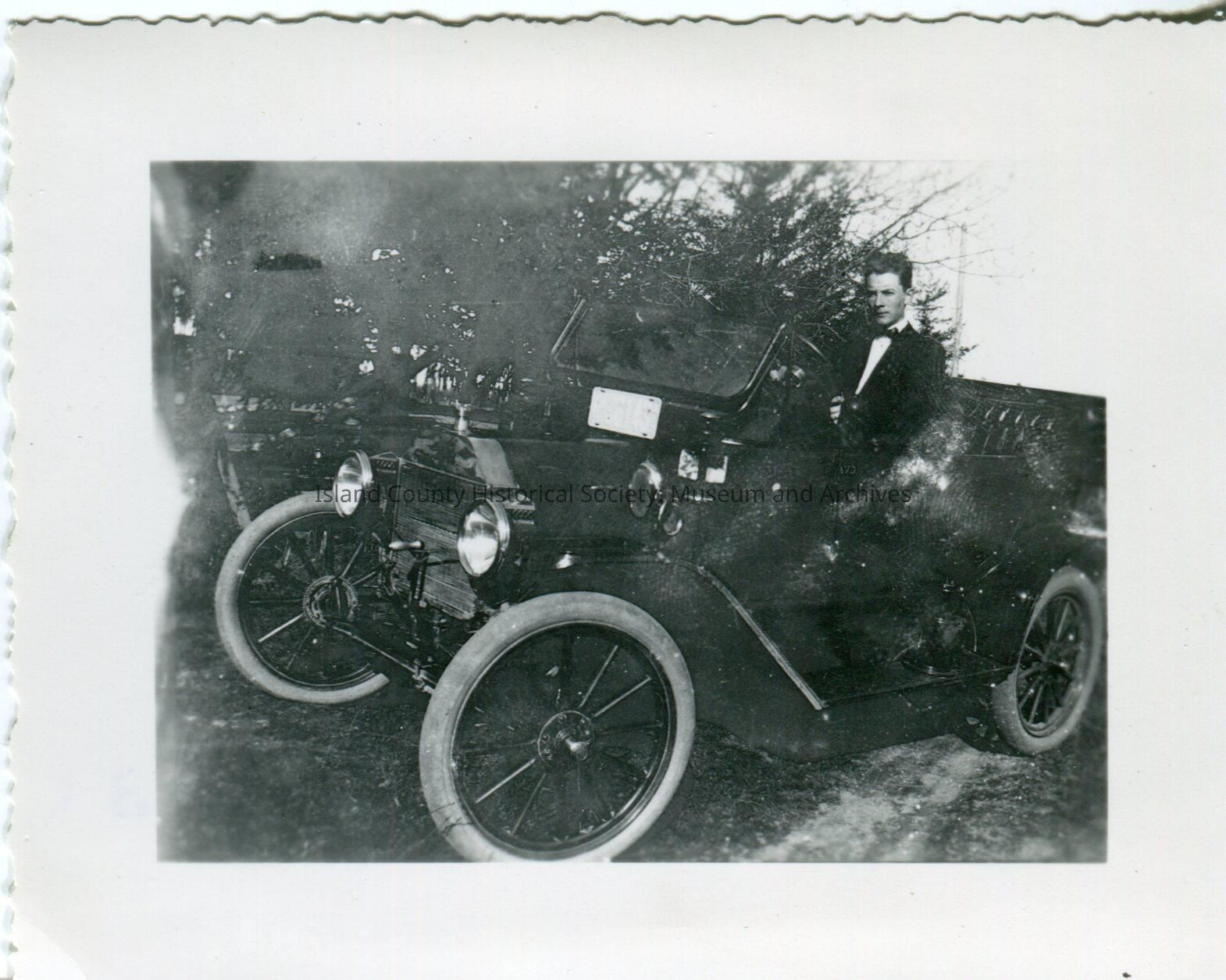 Early, Model T type, car with man sitting at the wheel. Dirt road, rimmed wheels. The young man (probably in his 20's or early 30''s) appears to be formally dressed in black jacket, bow tie, white shirt.Made/Created
