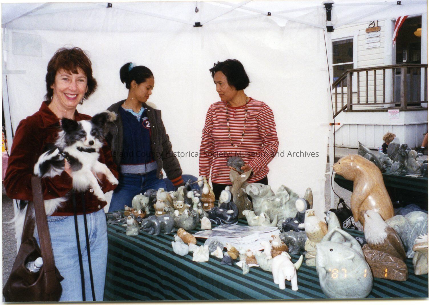 May 17, 2004 Coupeville Water Festival. Two women in the background behind a table with animal statues or sculptures. A woman holding a dog is in the foreground.