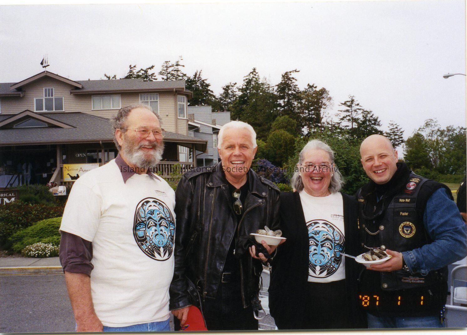 May 17, 2004 Coupeville Water Festival. Three men and a woman standing on Front Street in fromt of the museum. Two men - wearing motorcycle leathers - are holding bowls of mussels. The other man and woman are wearing Water Festival T-Shirts.Collection