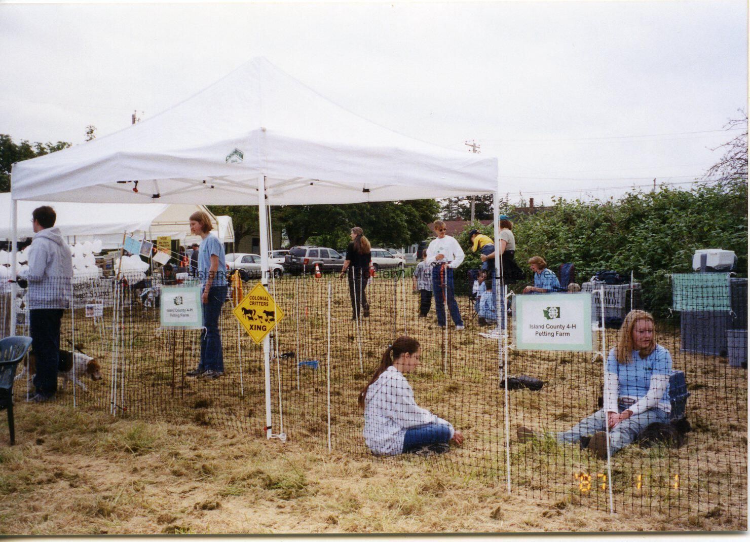 May 17, 2004 Coupeville Water Festival. The Island County 4-H group - petting area. Marquee/tent, two girls sitting on the ground, other people standing around.Collection