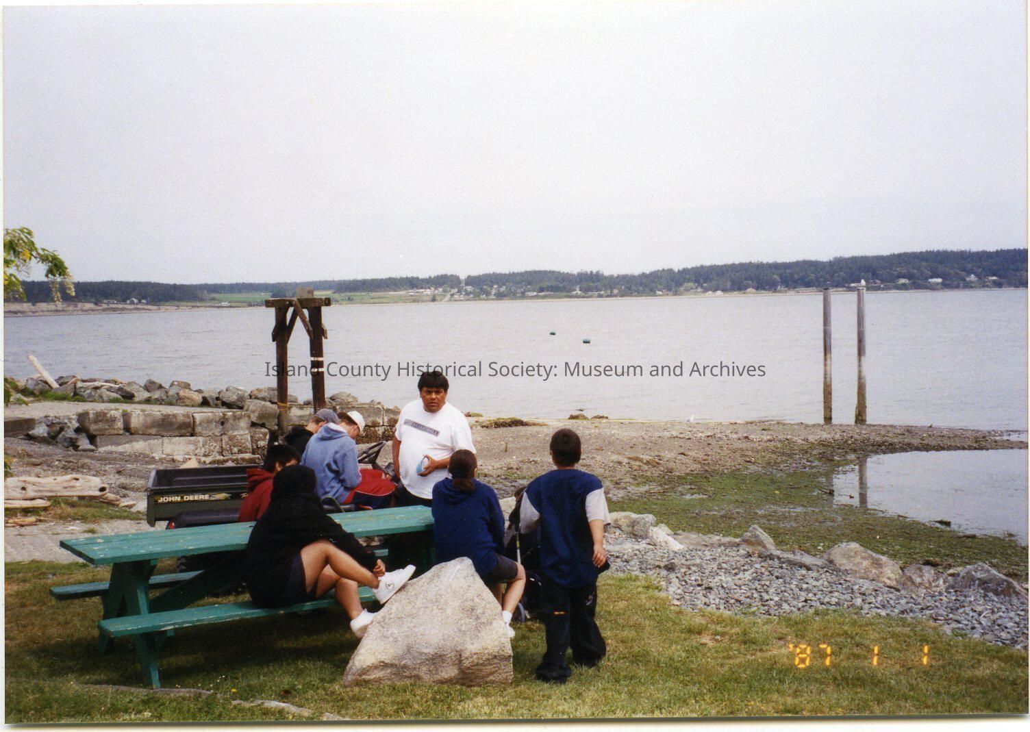 May 17, 2004 Coupeville Water Festival. People - adults and children at a picnic table at the Coupe Park beach access.