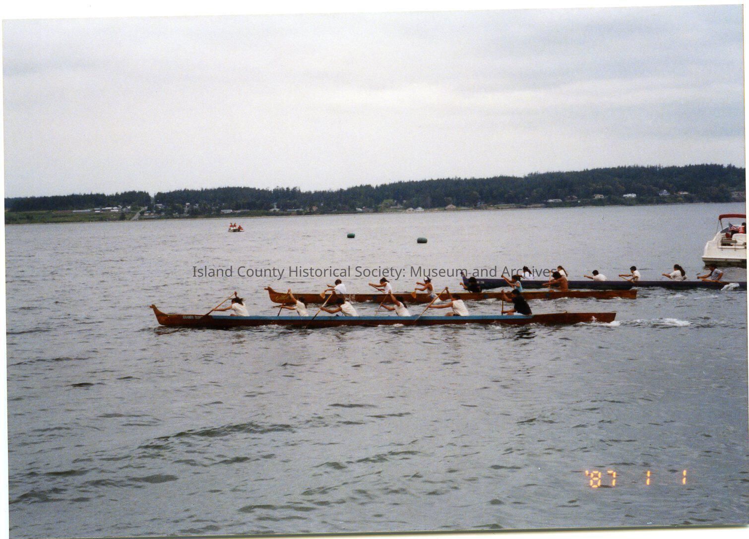 May 17, 2004 Coupeville Water Festival. From Coupe Park beach access. Canoe race underway. Three teams racing - young men and women - six in each canoe. Chase boat close to racers on right side.