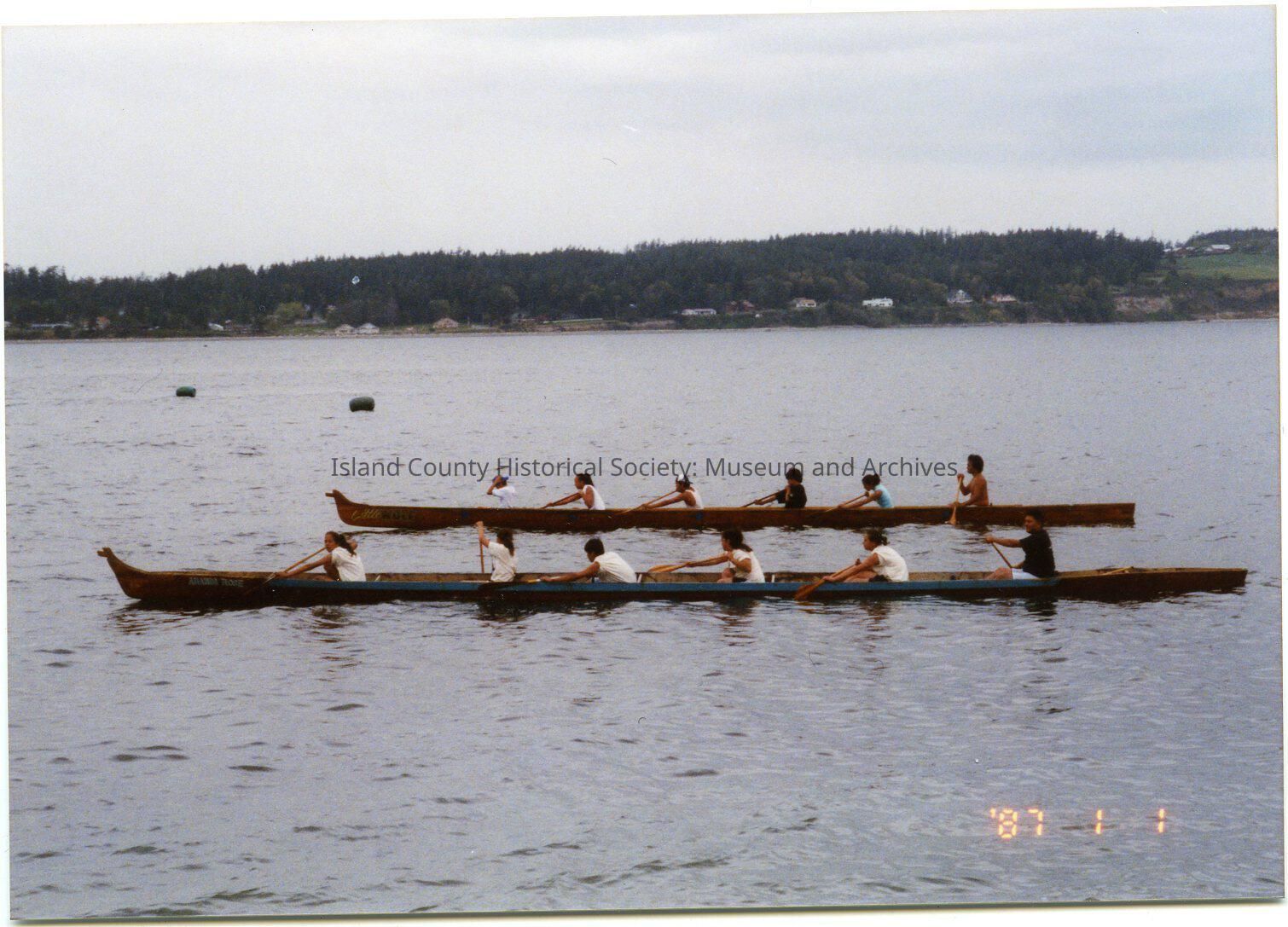 May 17, 2004 Coupeville Water Festival. From Coupe Park beach access. Canoe race underway. Two teams racing - young men and women - six in each canoe.