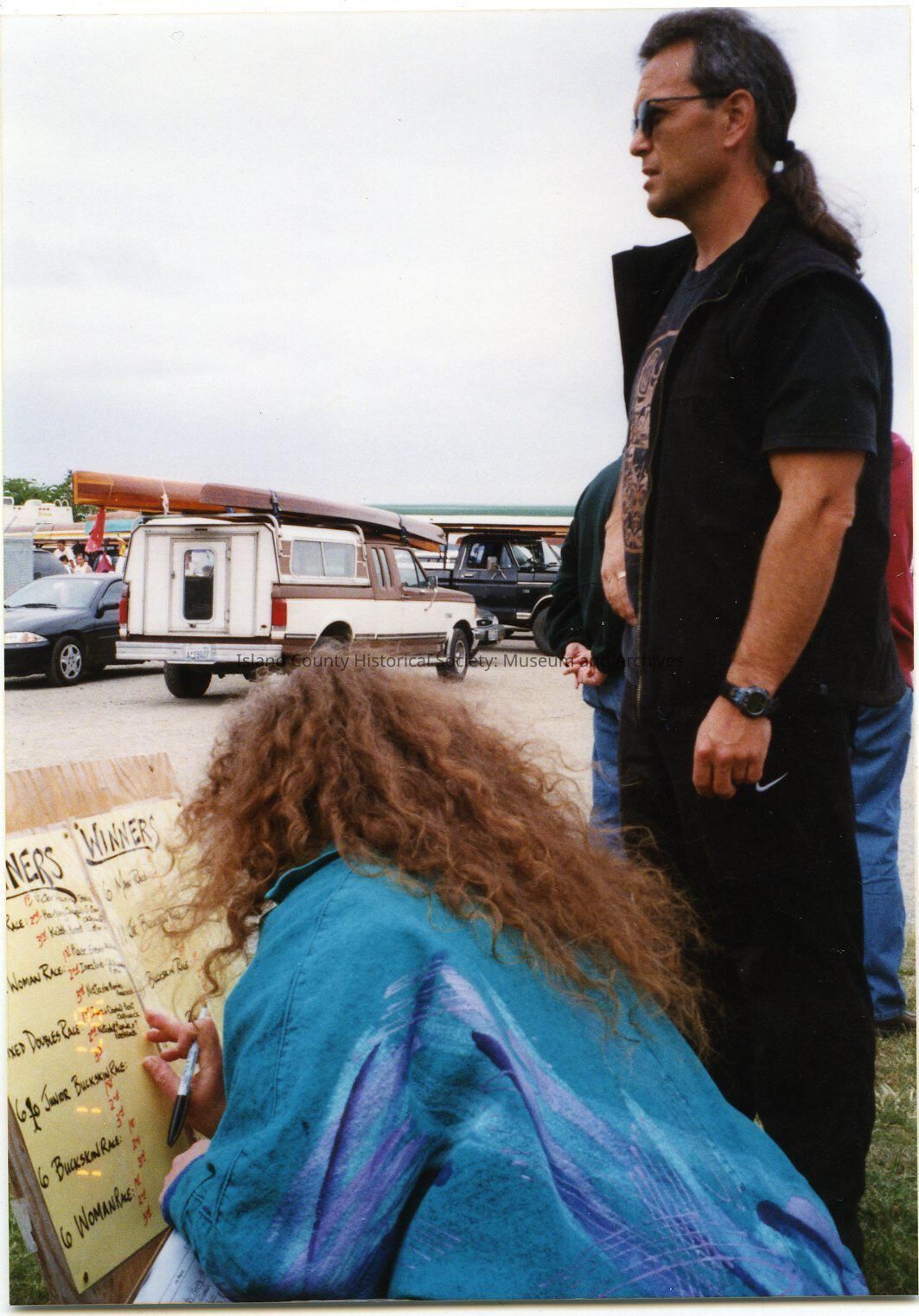May 17, 2004 Coupeville Water Festival. Trucks, canoes and people at the Coupe Park beach access. Woman in the foreground. Man with ponytail standing facing the park area.Collection