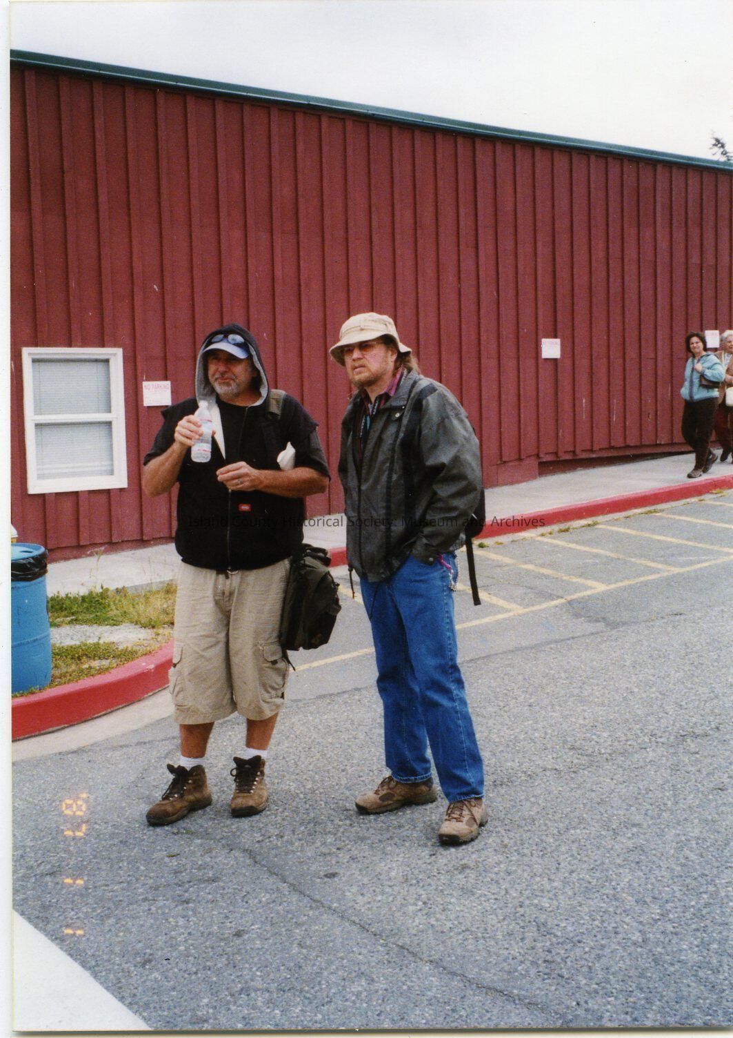 May 17, 2004 Coupeville Water Festival. Two men standing on the corner of Front and Alexander Streets beside the side of the Honey Bear/ Mariners Court. They are looking towards the wharf.