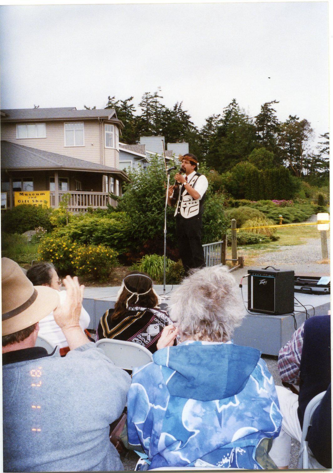 May 17, 2004 Coupeville Water Festival. Swil Kanim of the Lummi Nation playing a violin at the mike in front of the museum and wharf. He is wearing a vest with Native American designs.