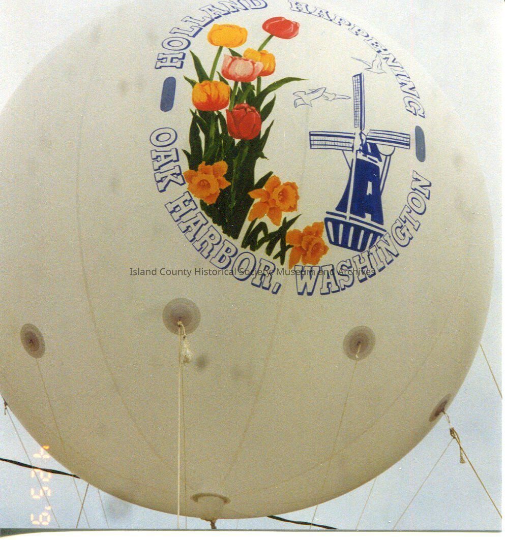 Photo of white large balloon - printed on it: Holland Happening Oak Harbor, Washington. Tulips and blue and white windmill. (Date on photo is 4 25 '92).