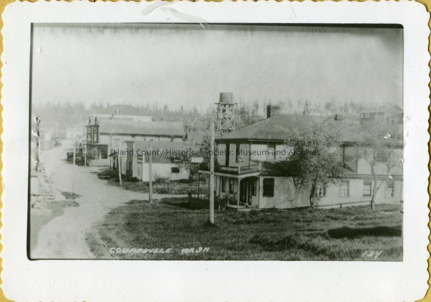 Large white building on the right side front, with a road in front leading to more buildings on the right side. Printed on the front "Coupeville Wash - 134" Printed on the back "892" Island Photo Lab 15 May 1964