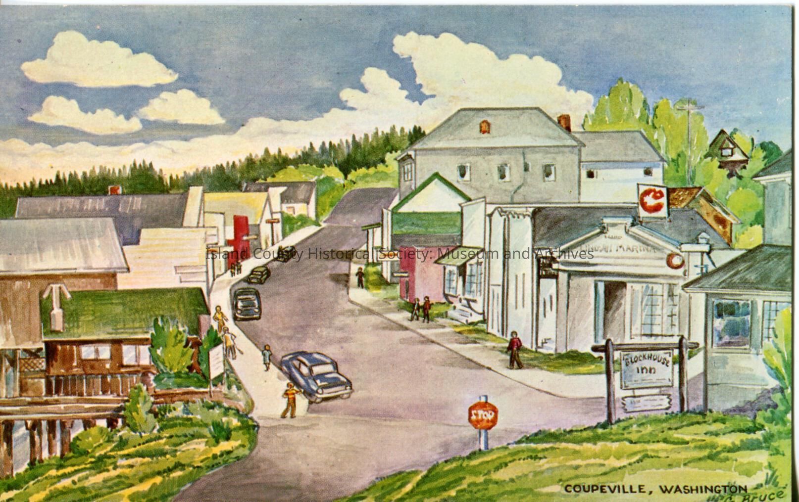 Watercolor postcard view of historic Coupeville's Front Street reproduced from a painting by G. Bruce.