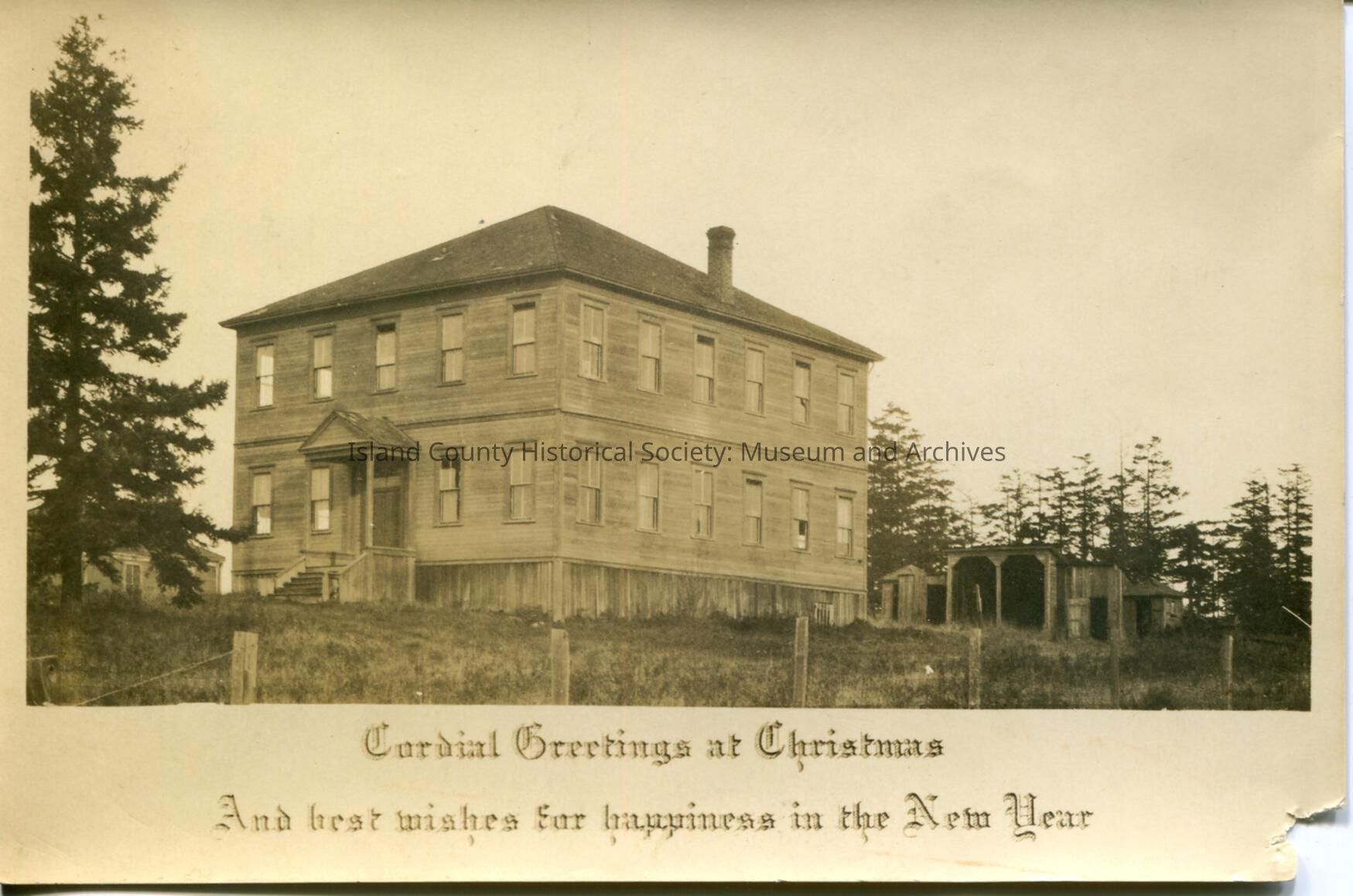 The 2nd Whidbey Academy with small outbuildings on the right side of the photo. Written on the bottom "Cordial Greetings at Christmas and best wishes for happiness in the New Year"