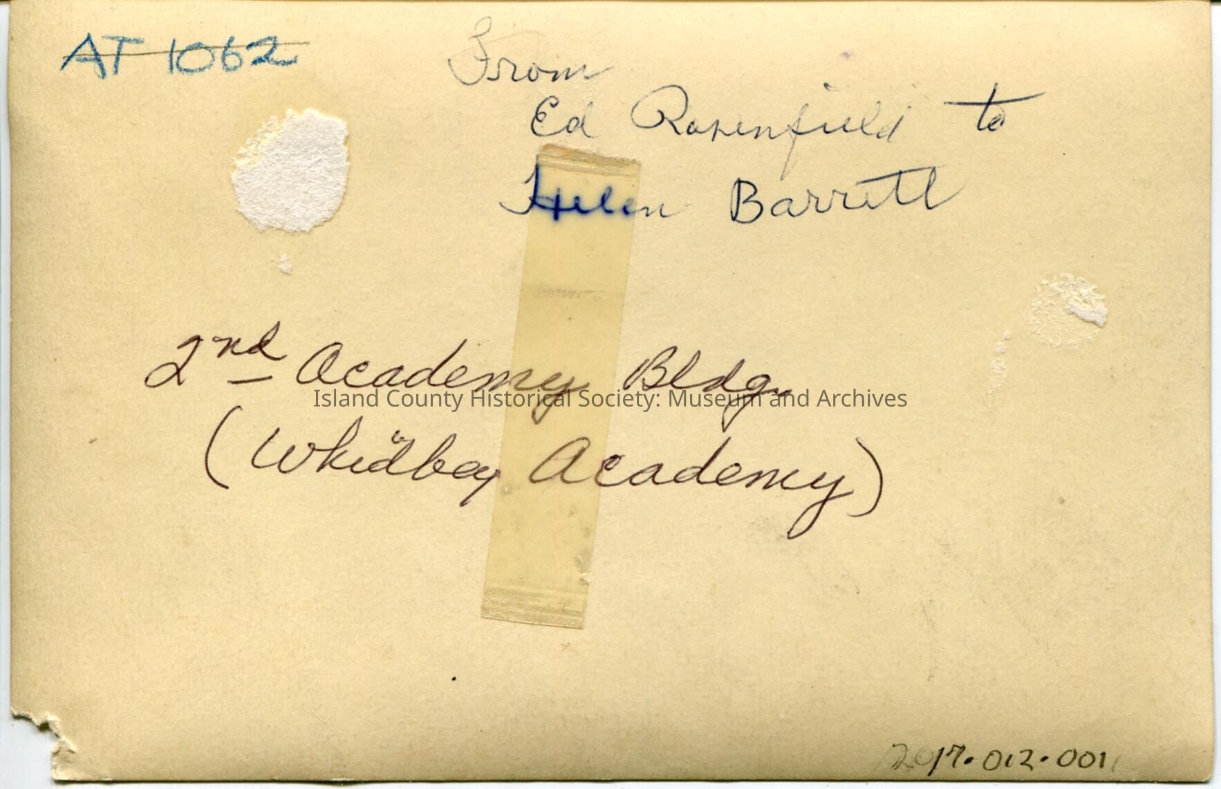 Written on the back" From Ed Rapinfield to Helen Barrett 2nd Academy Bldg(Whidbey Academy"