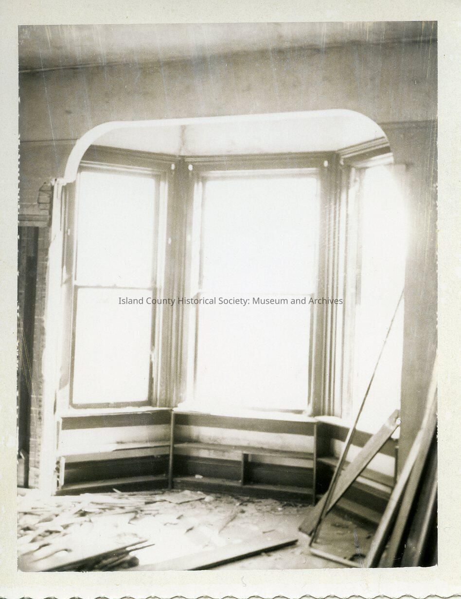 A polaroid photo showing the interior of the front parlor room in the Kohne House. There is debris on the floor and boards leaning agains the wall on the right side of the photo. The photo captures the bay window which was later moved to the Clapp House on Front Street by Ron Van Dyk. The house was torn down due to the damage by fire. The Coupeville High School gym now stands in its place. Ron Van Dyk took this picture before he removed the bay window for his own house.