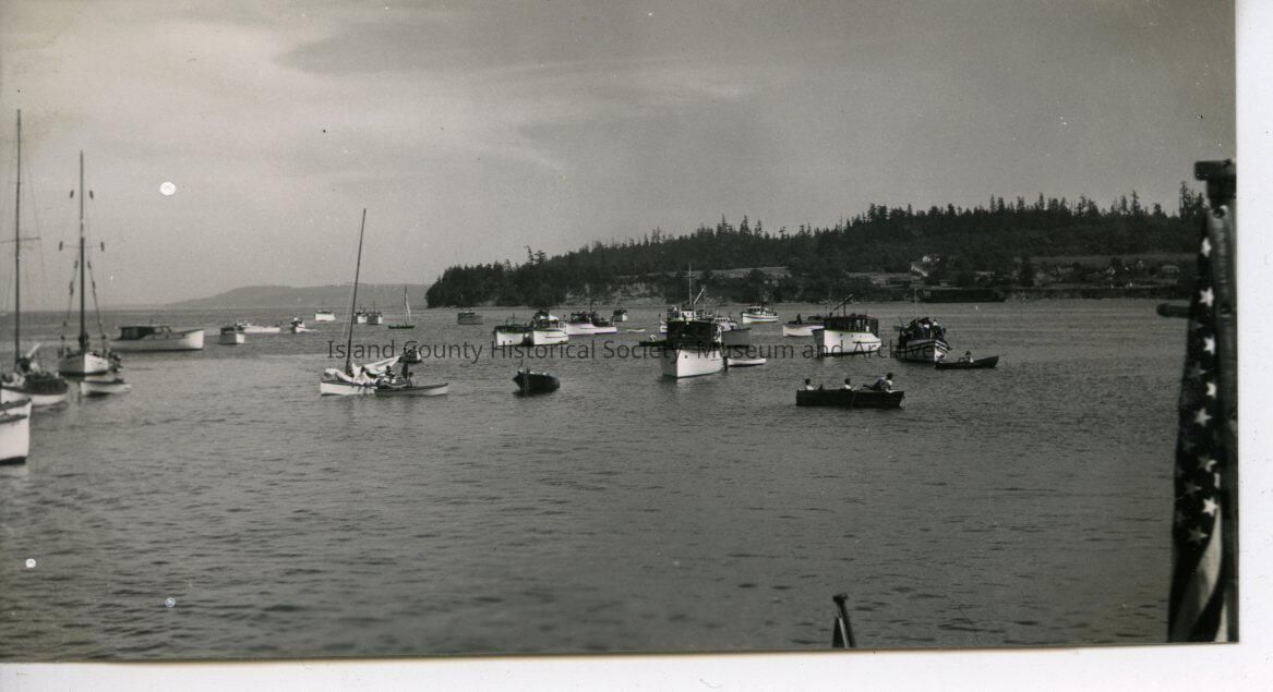 Black and white photograph of boats in Penn Cove during a water festival, probably in to watch the canoe races. The US flag can be glimpsed on the far right. Clear sky. (3 small white spots on left side of photo). Hand written on the back: "Coupeville Indian Festival August 1940".Collection