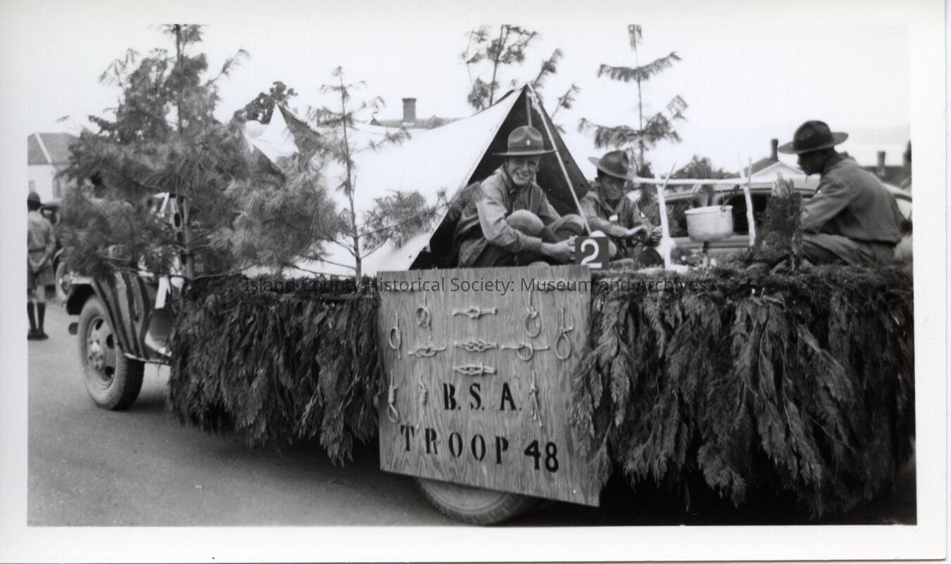 Black and white photograph of the BSA Troop 48 (boy scouts) float during the water festival parade. The float is "camouflaged" in leaves, branches and small trees. A tent is erected on the platformed top of the float. Three boys in scout uniforms sit around a "campfire". One of them smiles at the camera. The BSA sign on the side of the float has examples of different knots attached to it.Collection