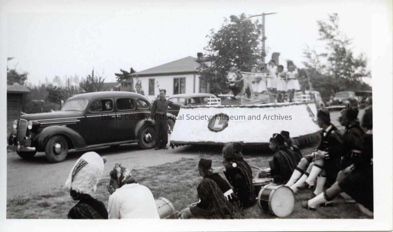 Black and white photograph of the Lions Club float during the water festival parade. A square platformed float with the L sign on the front. A lion sculpture rests on top. Girls in white/light colored skirts and t-shirts stand on top of the float. A man rests his hand on the platform, standing next to it. Cars are parked along the far side of the street. On the nearest side of the street sit members of a Scottish sort of band.Collection