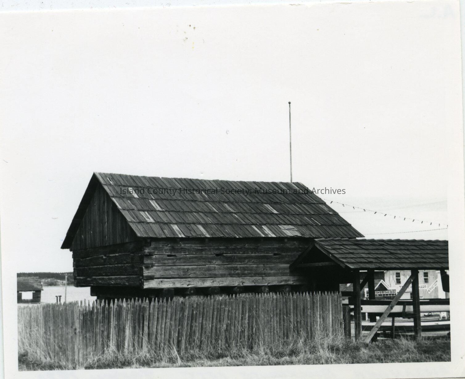 1855 Alexander Blockhouse- Seen from the south, looking towards Penn Cove, fence blocks lower part of Blockhouse, and runs east-west. On the left is the Coupville Warf. On the right is the Canoe Shed.