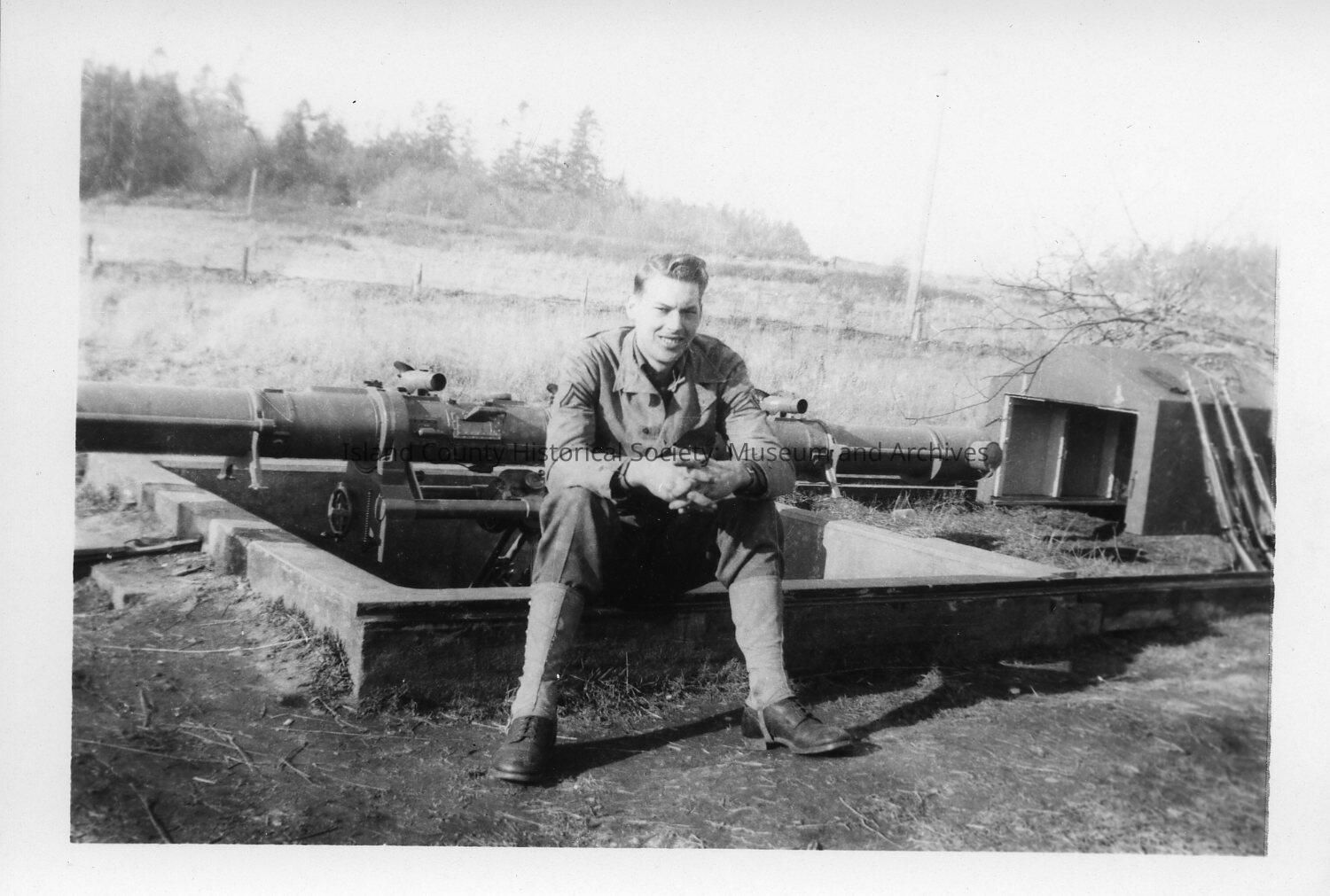 Photos of Fort Casey and soldiers. Man sitting on concrete gun placement. Gun on a placement under construction?