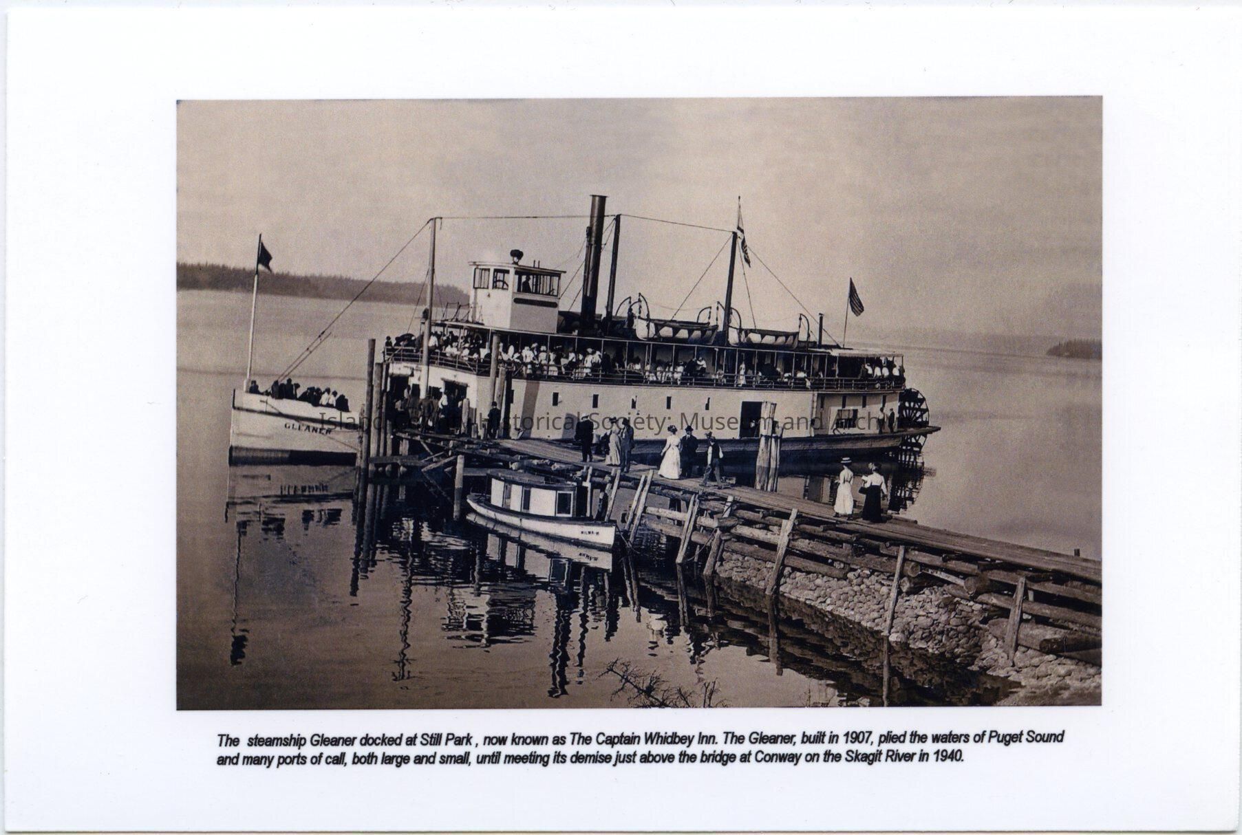 Caption at the bottom: "The steamship Gleaner docked at Still Park, now known as the Captain Whidbey Inn. The Gleaner, built in 1907, plied the waters of Pugget Sound and many ports of call, both large and small, until meeting its demise just above the bridge at Conway on the Skagit river in 1940".