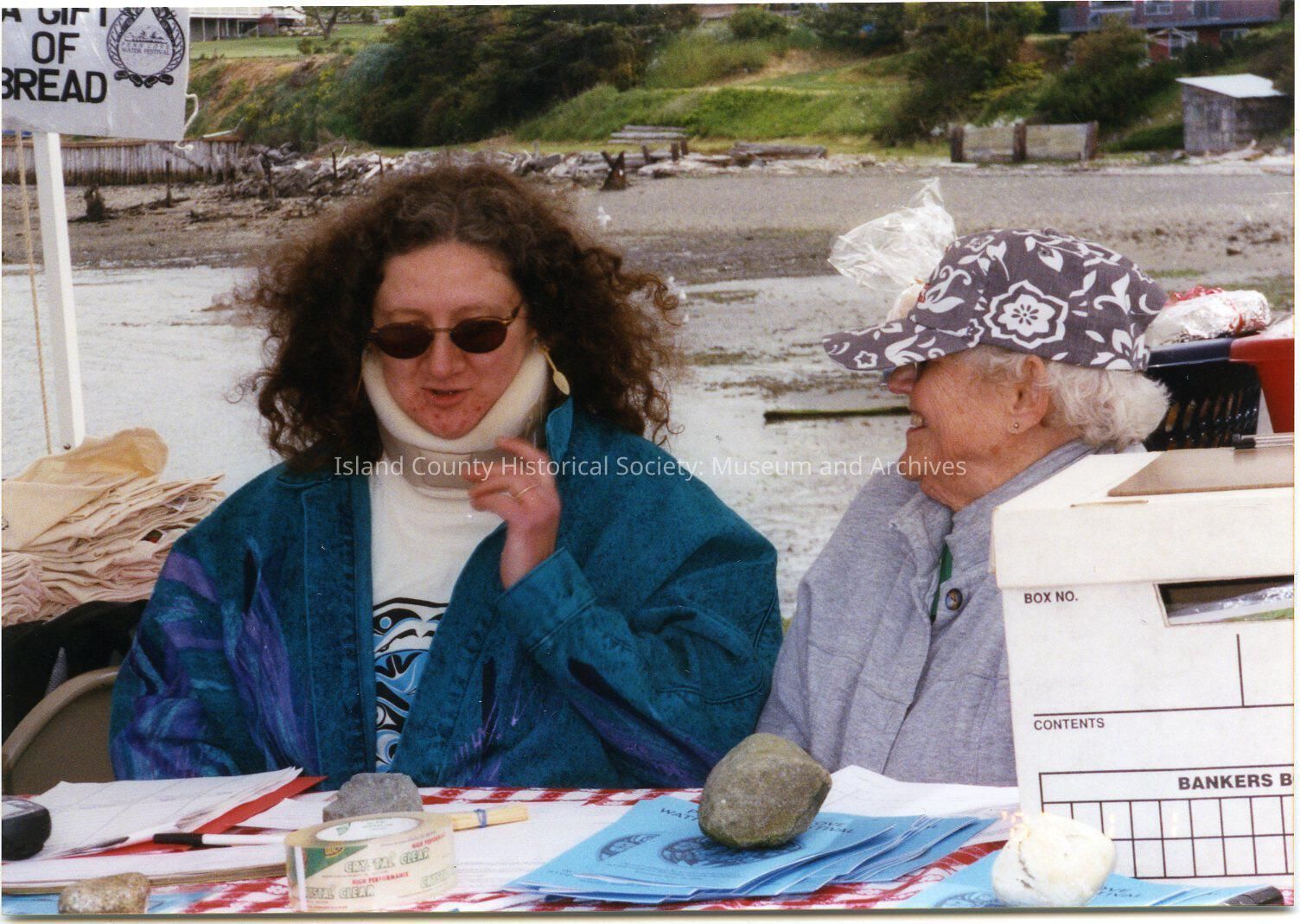 May 17, 2004 Coupeville Water Festival. Two women at probably canoe registration tent at Coupe Park beach access. One woman wearing jacket, has neck brace and sunglasses. The other woman has a blue and white baseball cap and blue shirt.Collection