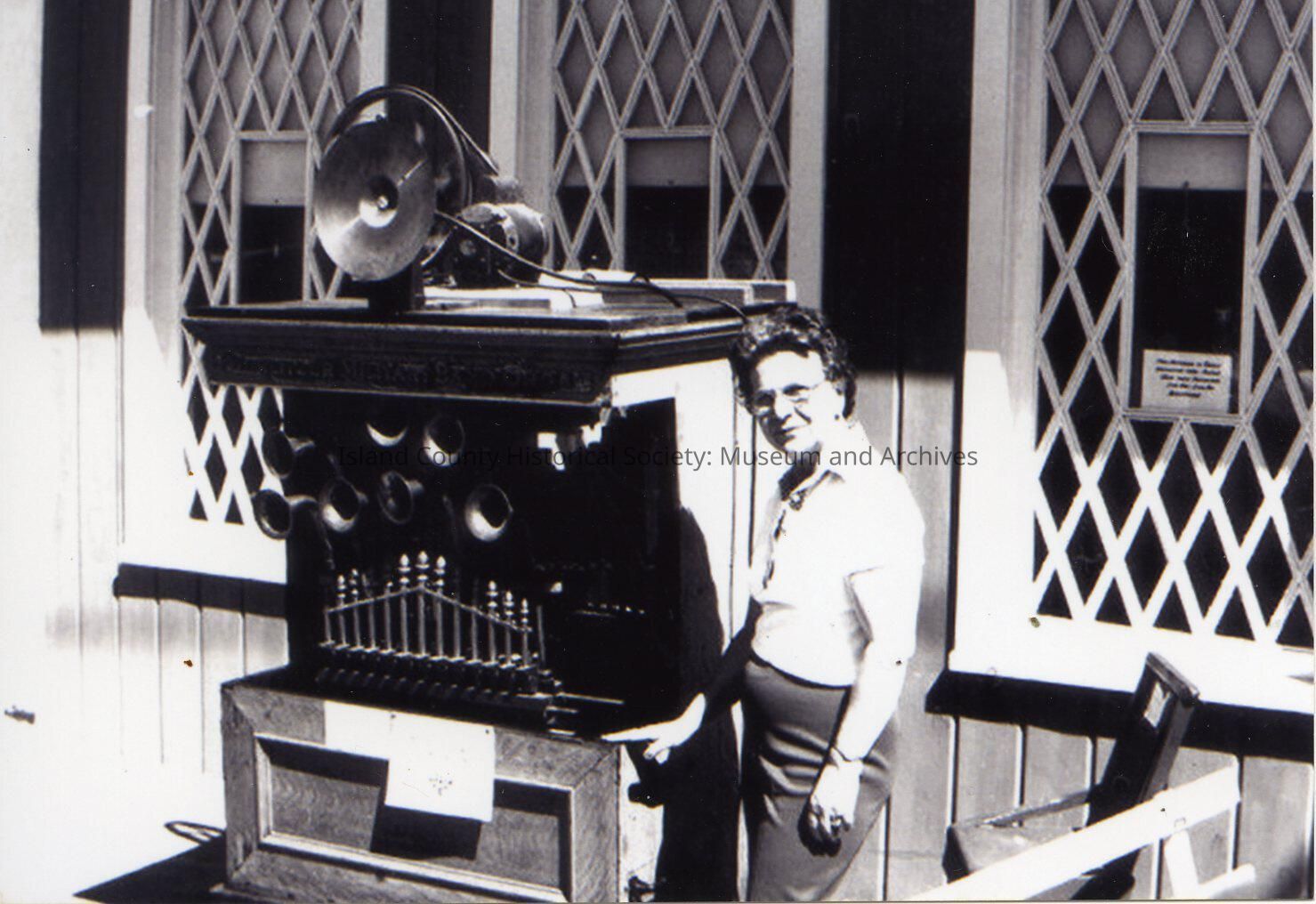 Photo of a large organ and Murrieal Short in front of the old ICHS museum. On the back: Typed in: Murrieal Short - Band Organ - 1979. Dated by Ritz as 06/29/10 - reprint.
