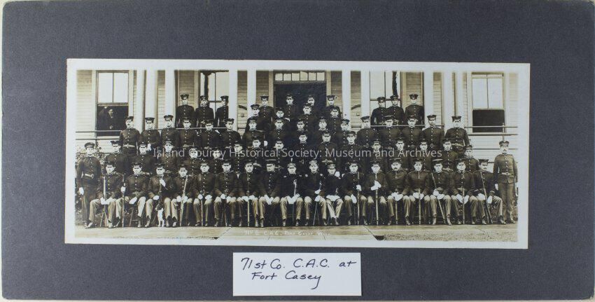 A black and white albumen photo of Fort Casey personnel posed in rows in front of a building. On the bottom center of the photo written on the photo: "71st Co. C.A.C. Fort Casey, Wash." on a white paper: "71st Co. C.A.C. at Fort Casey."