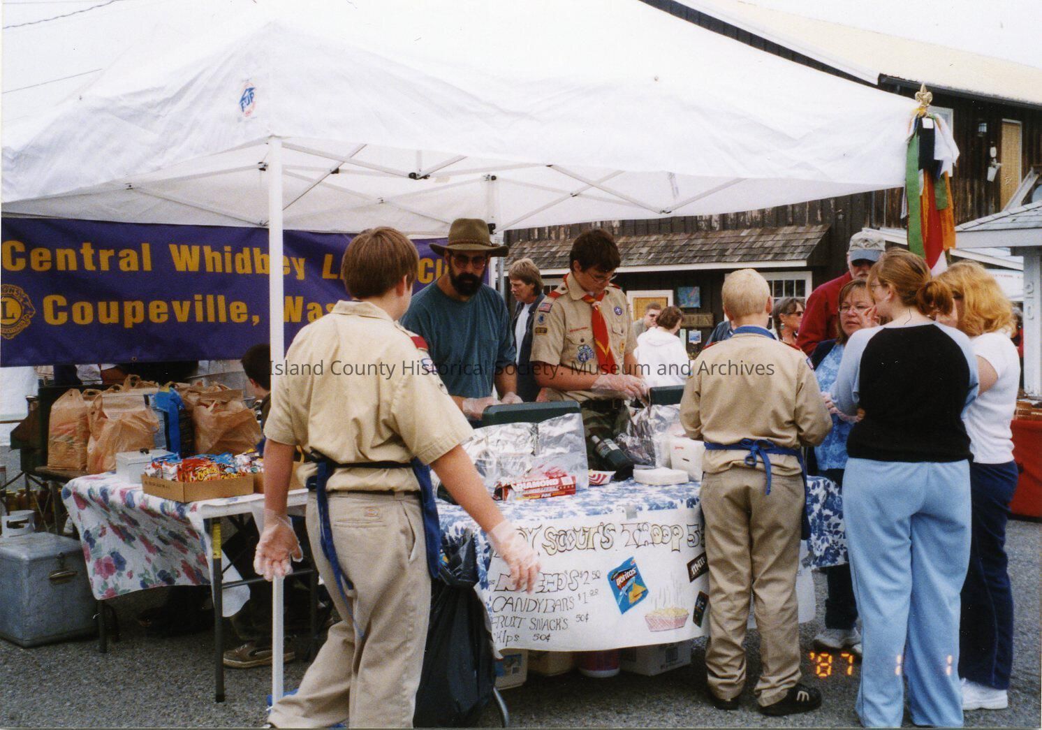 May 17, 2004 Coupeville Water Festival. People eating - vendor tents on Front Street. Lions and Boys Clubs.