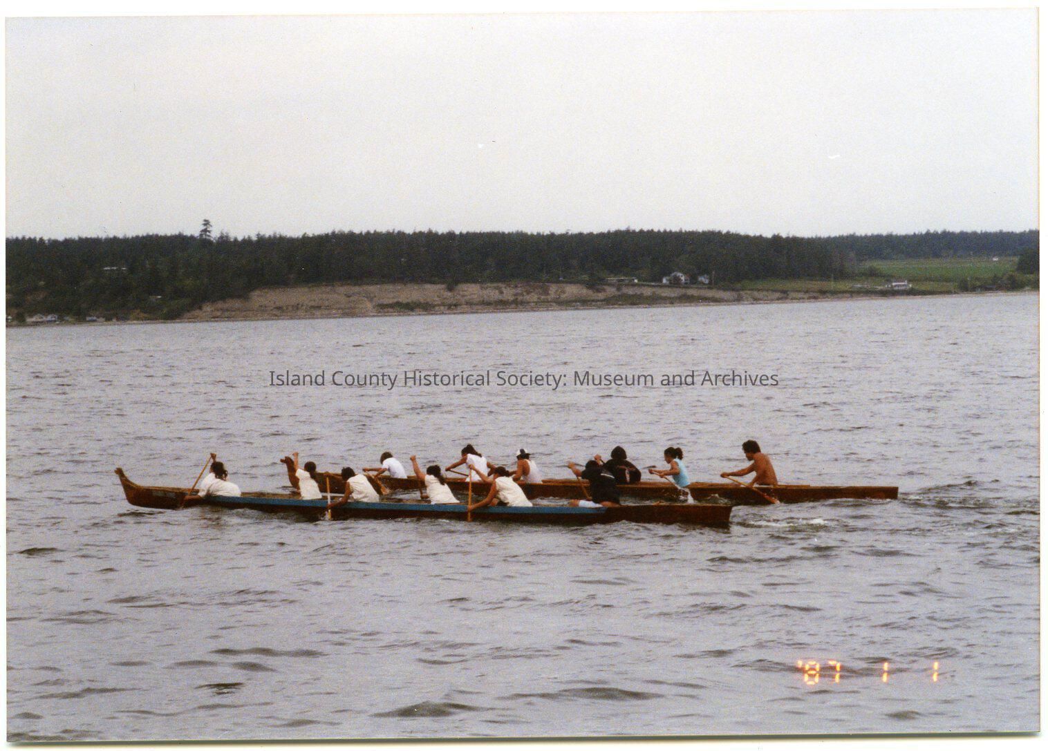 May 17, 2004 Coupeville Water Festival. From Coupe Park beach access. Canoe race underway. Two teams racing - young men and women - six in each canoe.
